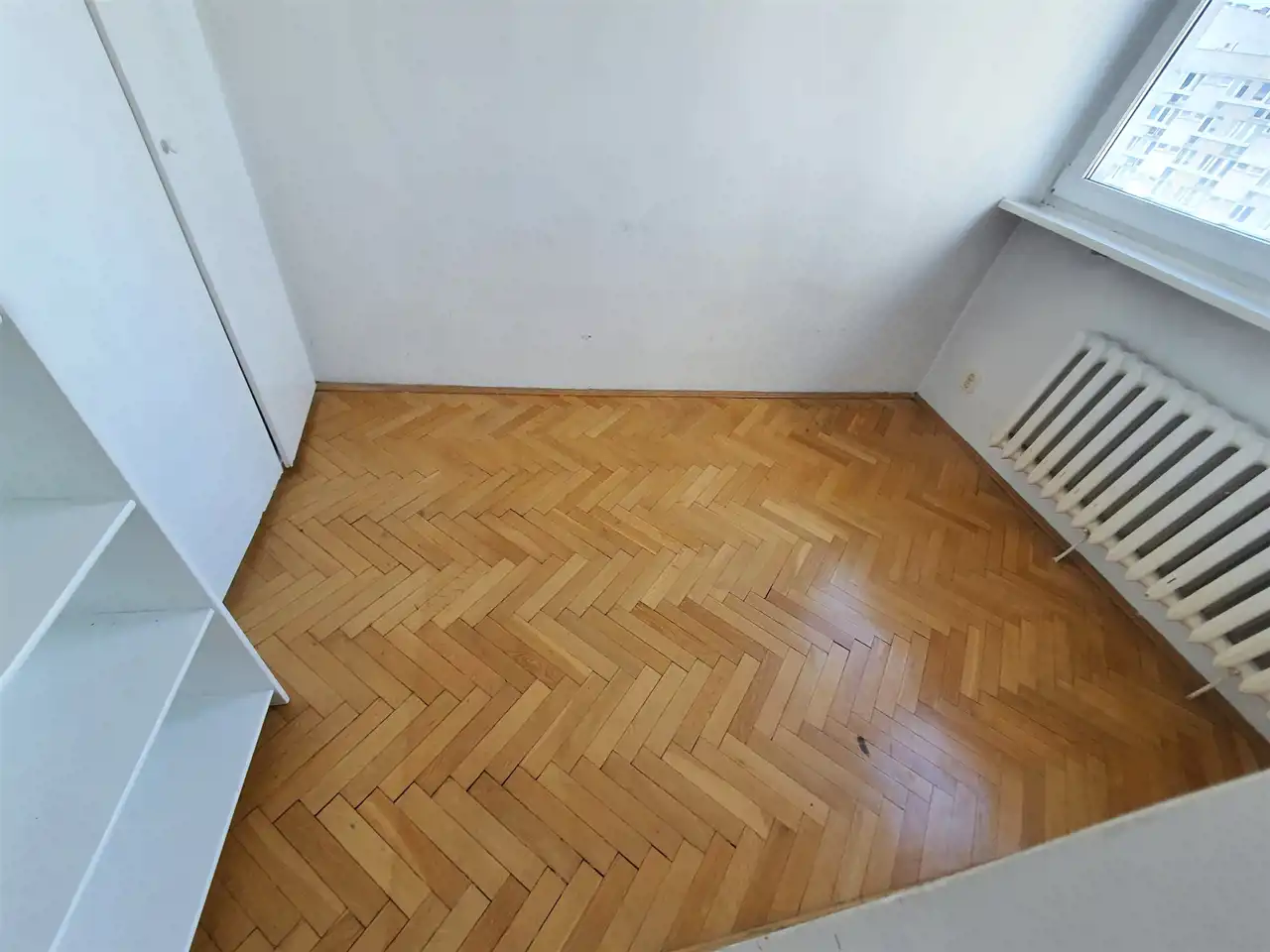 W części sypialnianej okno dwuskrzydłowe, duży kaloryfer pod oknem i wbudowana w ścianę starszej daty szafa dwuskrzydłowa z pawlaczem.