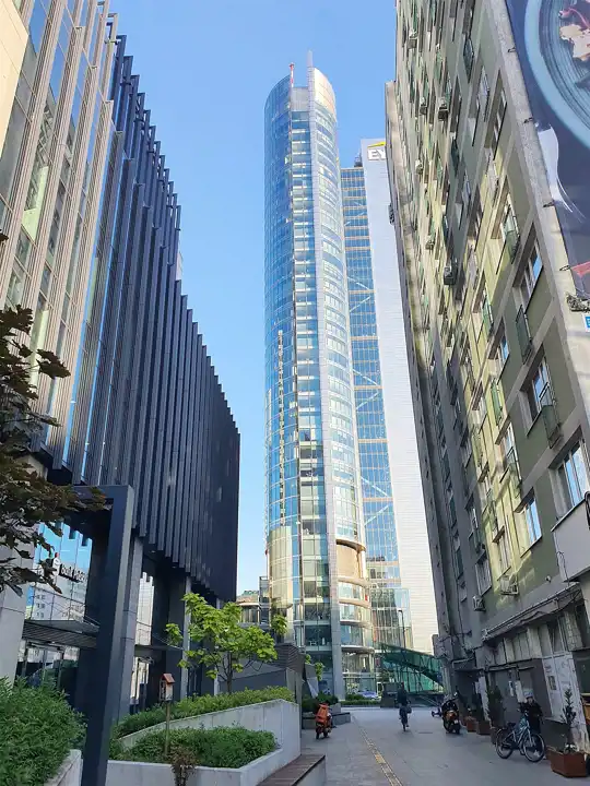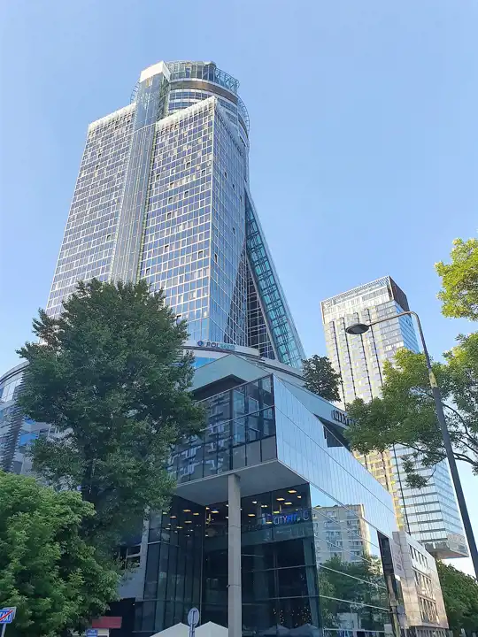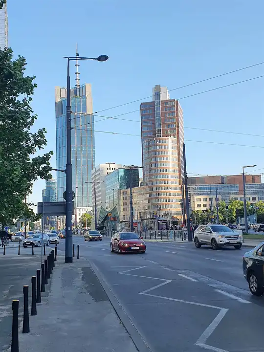 Okolica nowych komercyjnych inwestycji, nowoczesnych biurowców, drapaczy chmur i szklanych wieżowców.