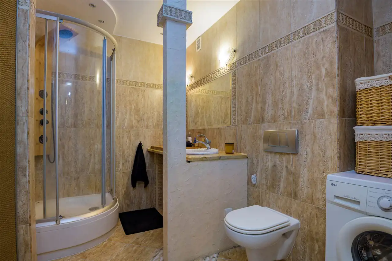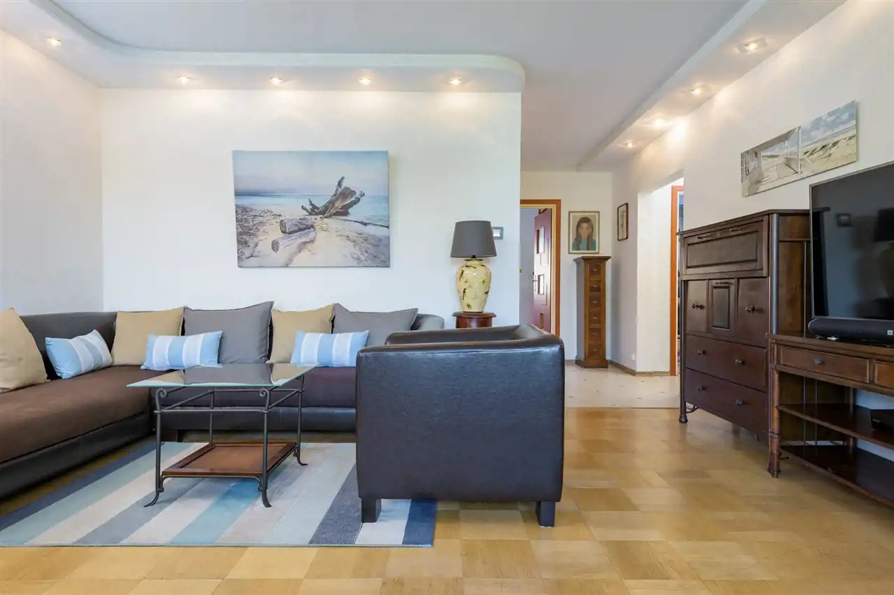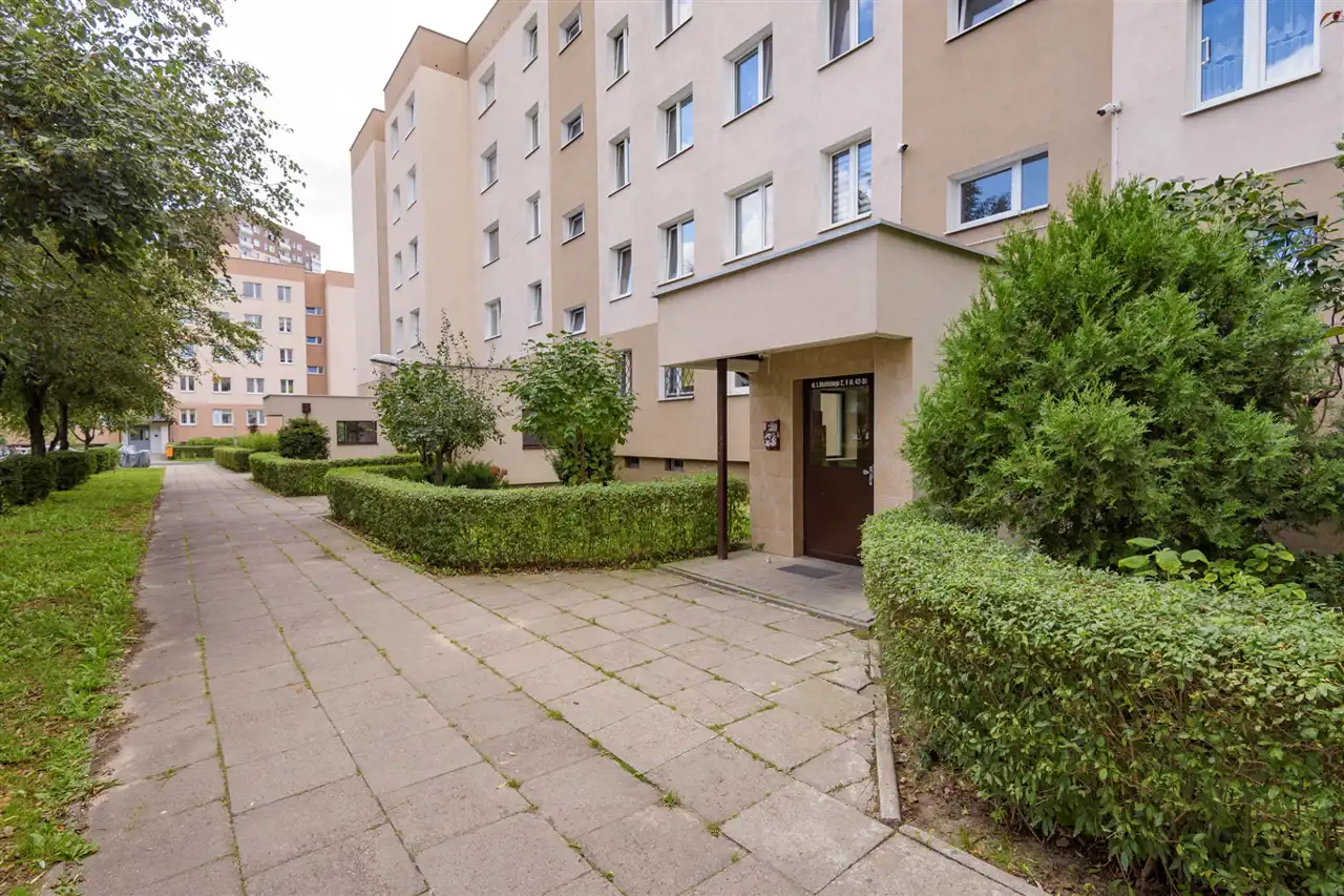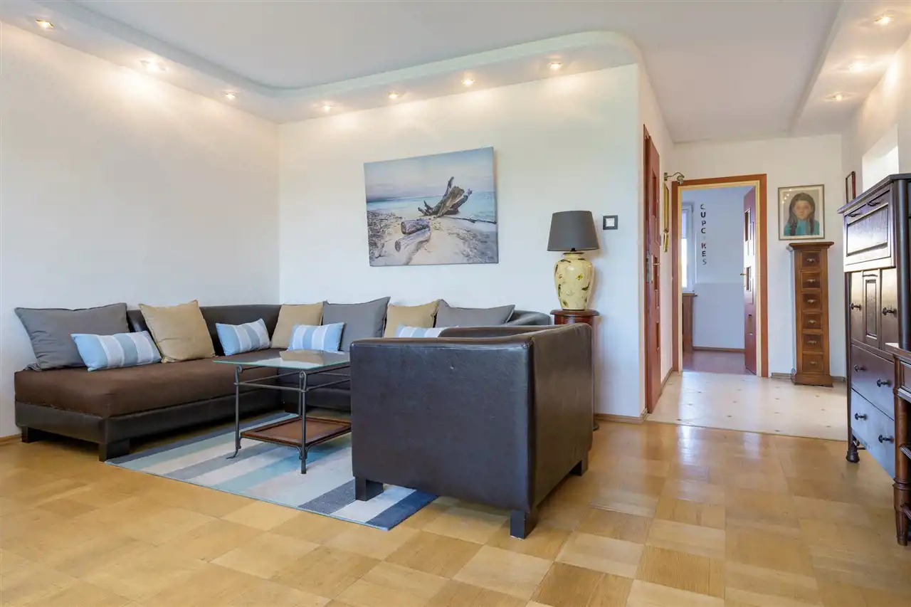 Składa się z dużego przestronnego salonu z pięknym balkonem z widokiem na drzewa, dwóch ustawnych sypialni oraz osobnej dużej kuchni. Dodatkowym atutem jest dużej wielkości łazienka (została połączona z osobną toaletą oraz częścią korytarza), która ma aż 6 metrów kwadratowych. Sporym atutem jest fakt, że mieszkanie jest dwustronne. Salon i główna sypialnia wychodzą na południowy zachód, dzięki czemu jest w nich dużo światła. A kuchnia i druga sypialnia to kierunek północno wschodni. Z obu stron nie ma żadnych bloków pod oknami, co sprawia, że żaden sąsiad nie zagląda do mieszkania.