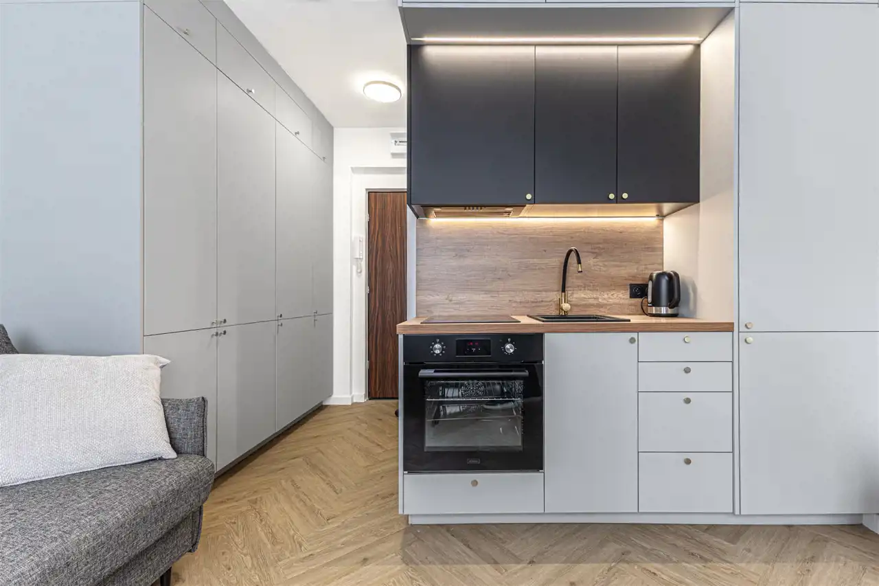 - Kuchnia: płyta indukcyjna, lodówka, okap, piekarnik, czajnik;
