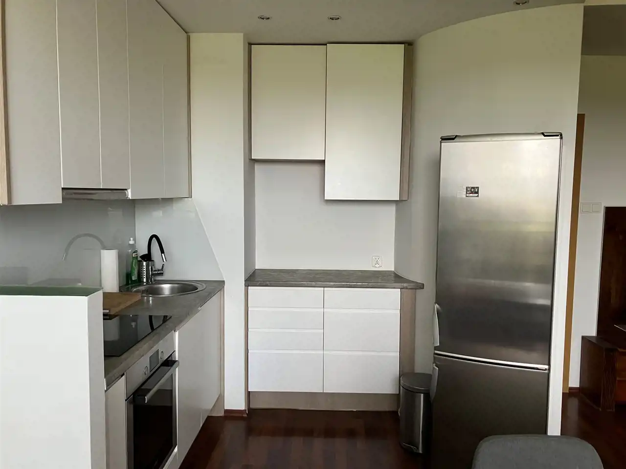 Salon z wyjściem na balkon (mieści się stolik i 2 krzesełka) połączony elegancką zabudowaną kuchnią + sypialnia + duża łazienka wspólnie z toaletą.