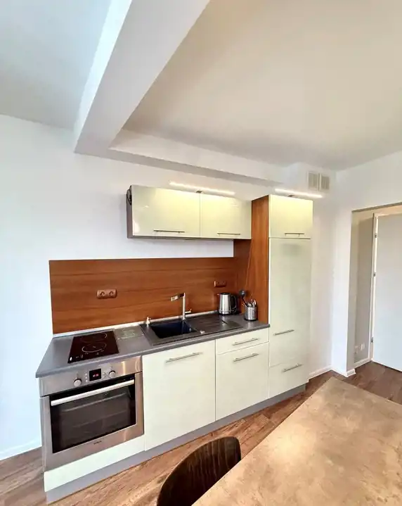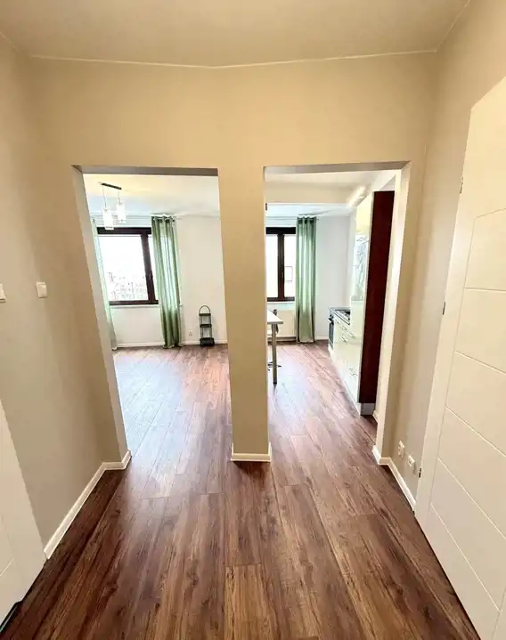 Ustawny pokój dzienny z dwoma oknami, widna kuchnia (aneks), łazienka z wanną oraz przedpokój z dużą garderobą.