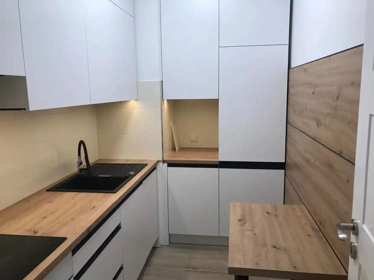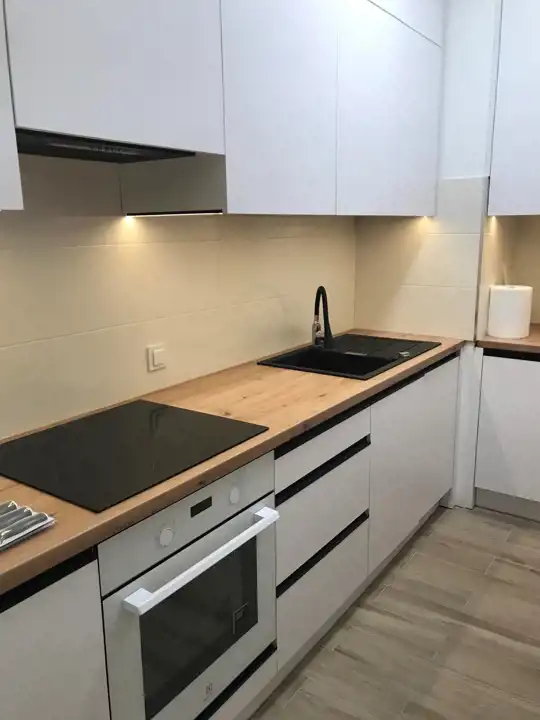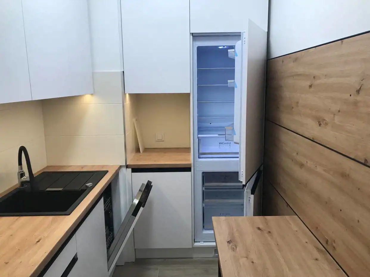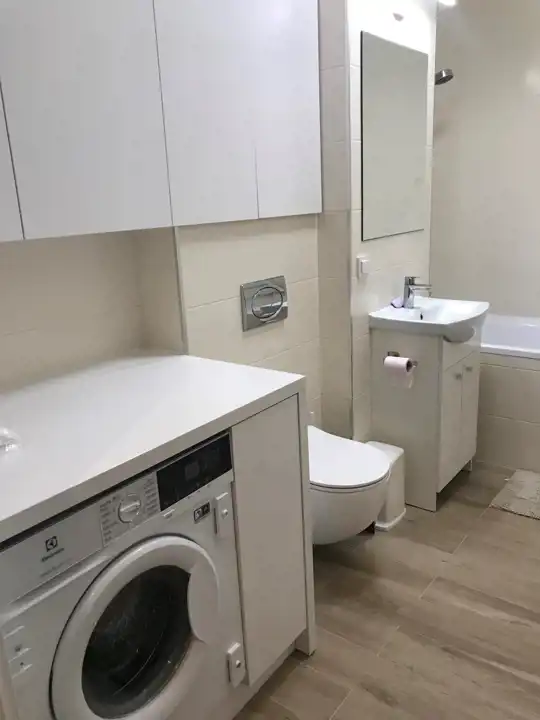 Oddzielna kuchnia (umeblowana, sprzęt AGD: lodówka, zmywarka, kuchnia indukcyjna, piekarnik, okap). W łazience pralka
