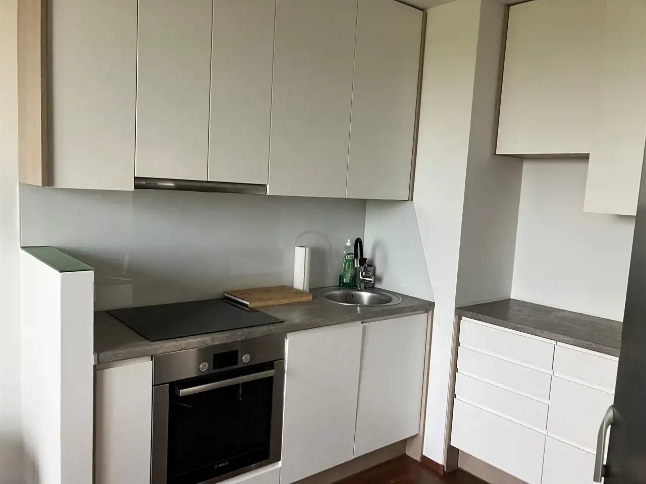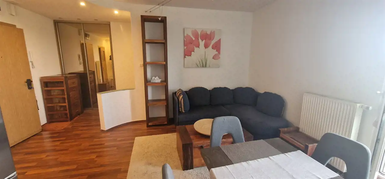 Salon z wyjściem na balkon (mieści się stolik i 2 krzesełka) połączony elegancką zabudowaną kuchnią + sypialnia + duża łazienka wspólnie z toaletą.