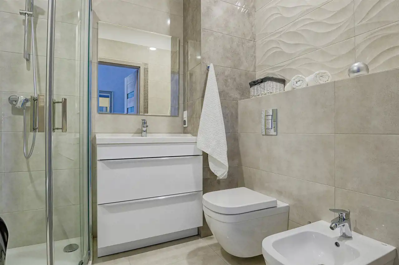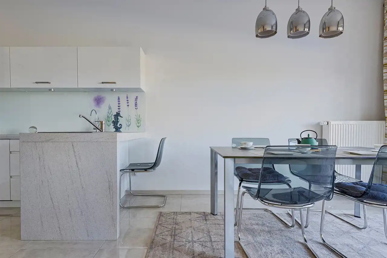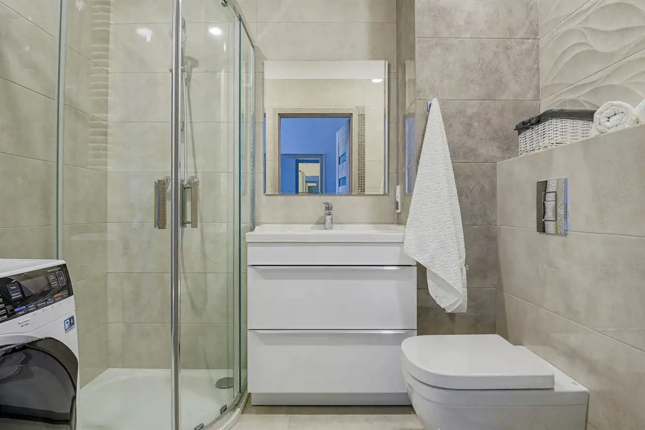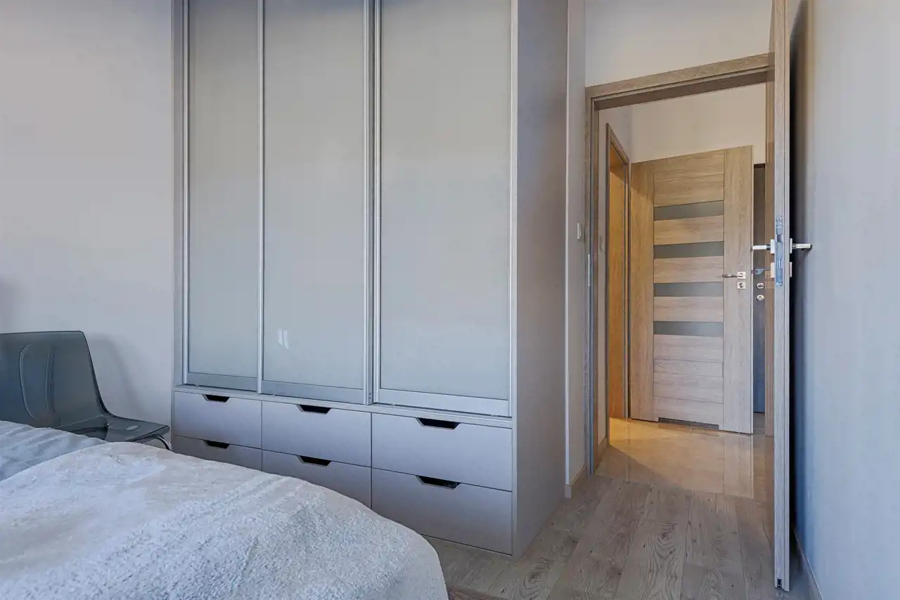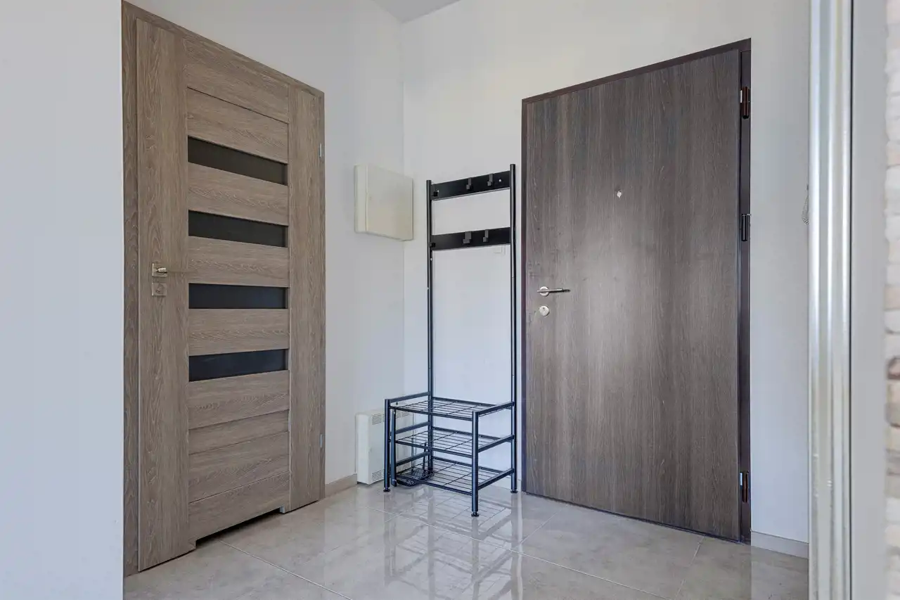 W tym mieszkaniu mamy sprawdzony i często stosowany aktualnie rozkład. Dzięki temu wykorzystana jest cała przestrzeń. W związku z tym przy niedużym metrażu mieści nam się wszystko: zgrabny korytarz z szafą oraz wieszakami, łazienka z pralką i prysznicem czy salon z dużym stołem i kanapą. Kuchnia jest tak zaprojektowana, aby było dużo szafek do przechowywania oraz odpowiednia ilość blatu roboczego. Ważne jest, że wszystko jest nieużywane, więc nie wymaga żadnych napraw albo odświeżania. Od wykończenia w mieszkaniu nikt nie mieszkał.