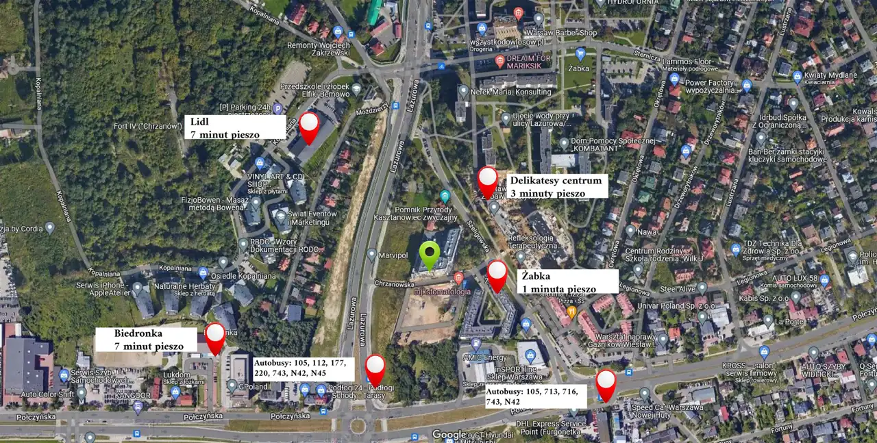 Mieszkanie znajduje się na ulicy Chrzanowskiej 4, skąd łatwo dostać się do centrum. W pobliżu mamy sporo sklepów czy innych potrzebnych usług. Do nowo powstającej stacji metra będzie się szło zaledwie 5 minut. Warto zwrócić uwagę, że dzięki temu okolica bardzo się rozwija, dlatego mieszkanie jest świetną inwestycją.