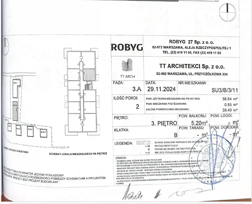 Do mieszkania przynależy taras, miejsce parkingowe (dodatkowo płatne 50 000 zł ). Lokal jest gotowy do wprowadzenia od stycznia 2026. Stan deweloperski (co daje nowemu właścicielowi możliwość aranżacji wnętrza według własnych potrzeb).