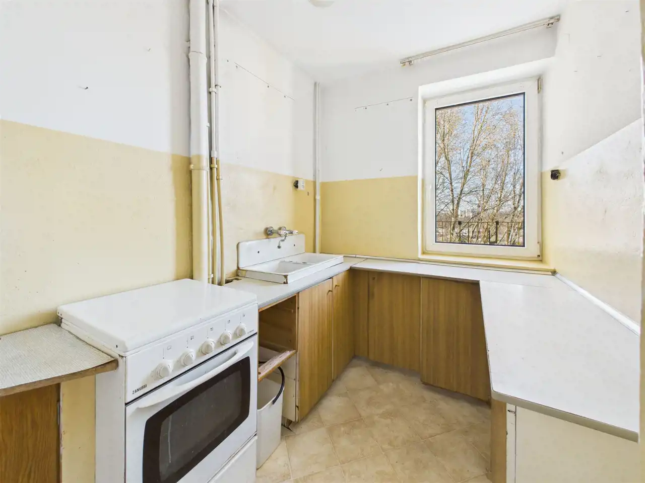 - widna kuchnia z oknem i widokiem na park,