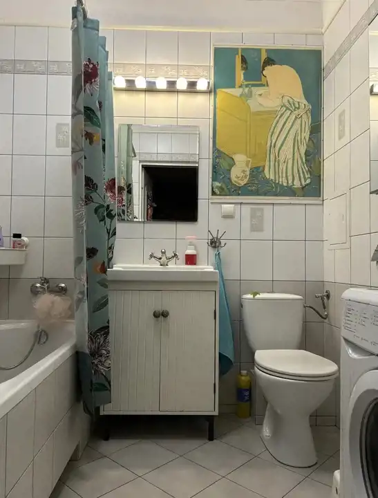 - łazienka z WC, wanną i pralką.