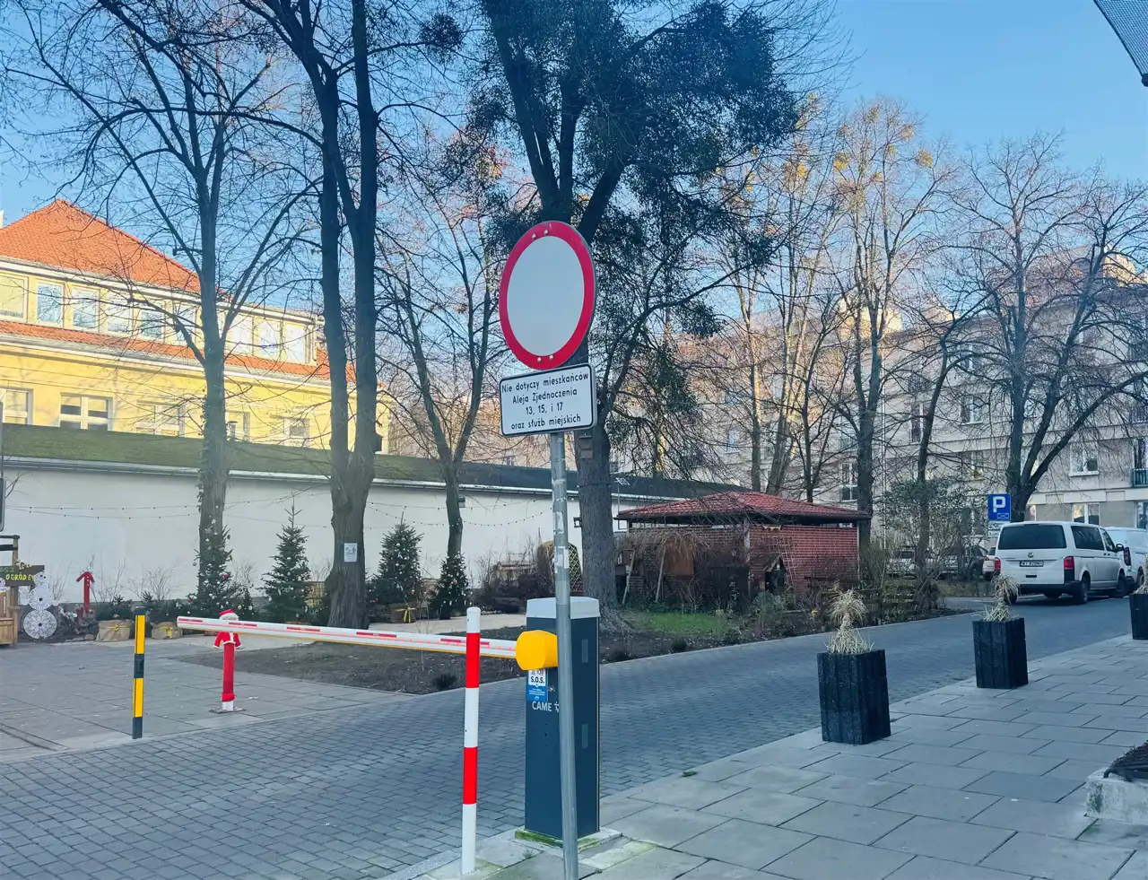 Parking należący do wspólnoty na tyłach budynku od strony wejścia do klatki schodowej zabezpieczony szlabanem i otwierany z pilota lub komórki.