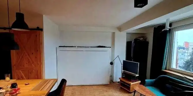* jasny, ustawny pokój dzienny z miejscem na strefę wypoczynkową i sypialnianą