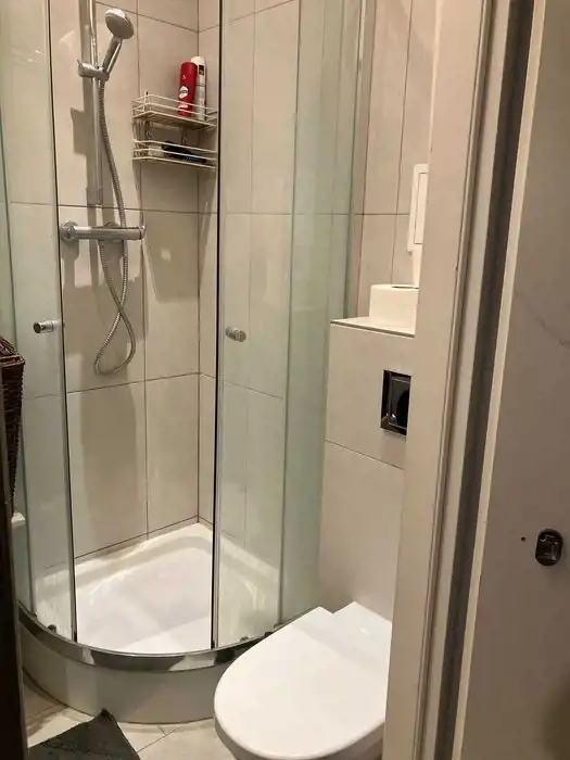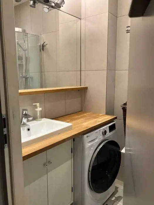 - Łazienka: Nowoczesna, z kabiną prysznicową oraz pralko-suszarką.