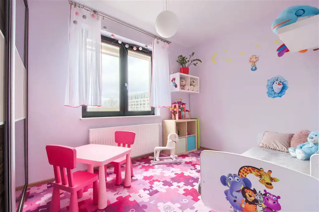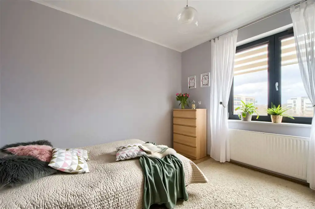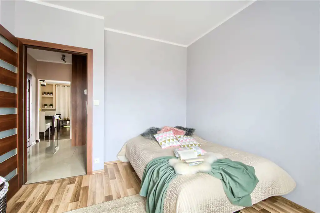 Mieszkanie składa się z dwóch sypialni, salonu z aneksem kuchennych, korytarza, łazienki oraz osobnej toalety. Pomieszczenia są wyjątkowo ustawne. Bardzo duży salon z oknami na stronę południową dzięki swojemu układowi jest bardzo przytulny a zmieści się wszystko co jest potrzebne do wygodnego funkcjonowania. Między innymi duży stół, wielka narożna kanapa i spory aneks kuchenny. Łazienka jest kwadratowa i dzięki temu, że w mieszkaniu mamy osobną toaletę to mamy i prysznic i wannę. Sypialnie również są bardzo ustawne i obie mają powyżej 10 metrów kwadratowych powierzchni.
