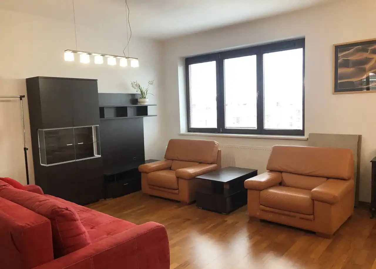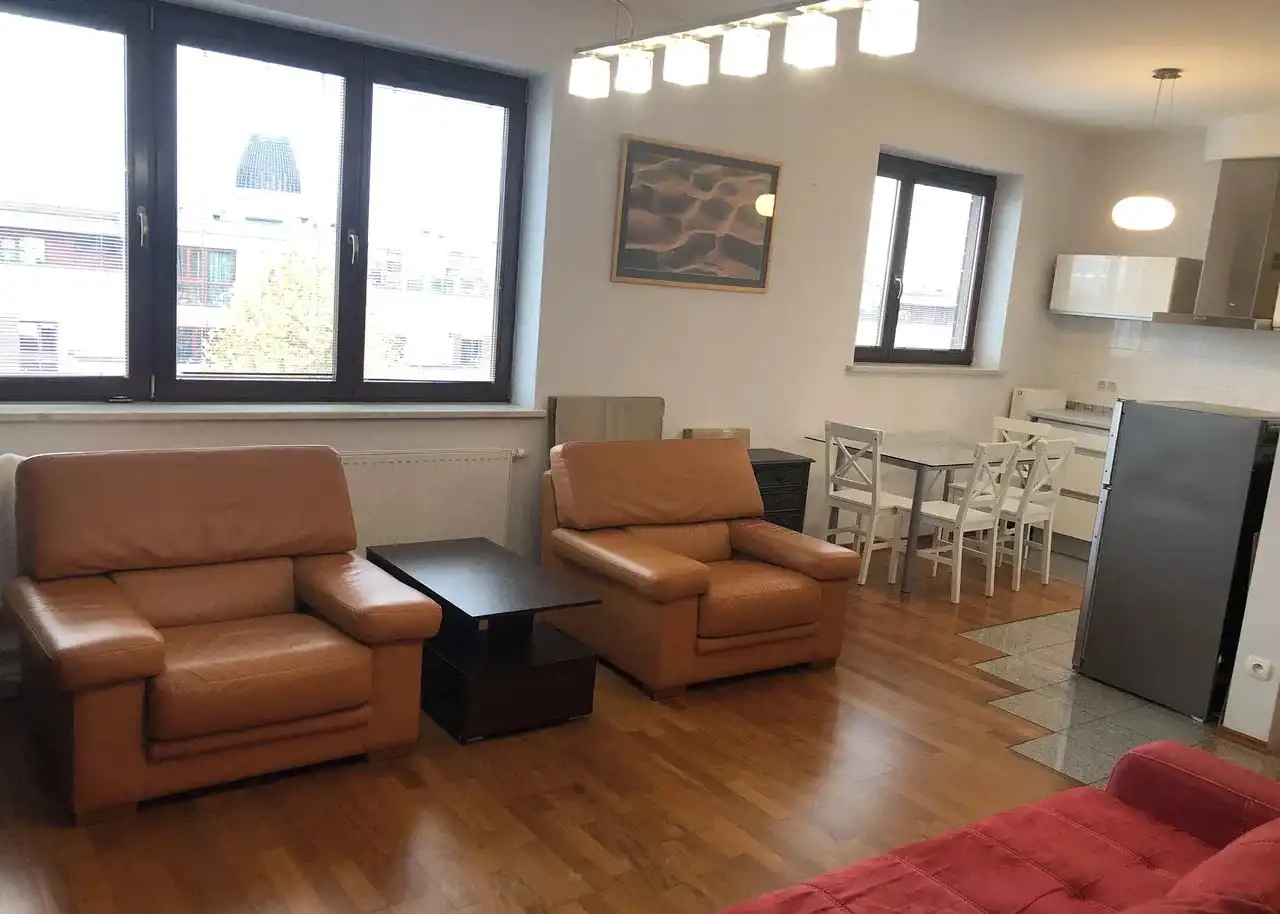- rozkładana kanapa, dwa fotele, ława, stół z czterema krzesłami, witryna i ścianka telewizyjna, a także pełna zabudowa kuchenna z wyposażeniem i dwie szafy w zabudowie.