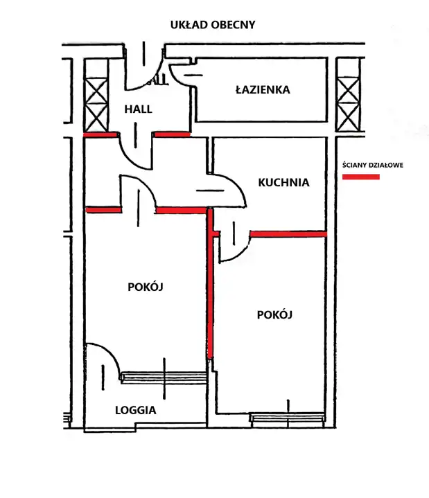 Istnieje możliwość zmiany obecnego układu mieszkania i uzyskania niezależnych dwóch pokoi oraz kuchni, z oddzielnymi wejściami do wszytkich pomieszczeń.