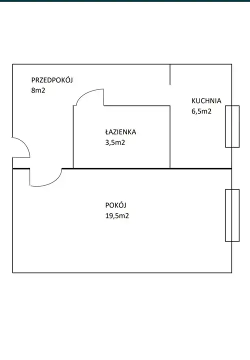Obecnie pokój (19,5 m2), oddzielna widna kuchnia (6,5 m2), łazienka (3 m2), przedpokój (8 m2).