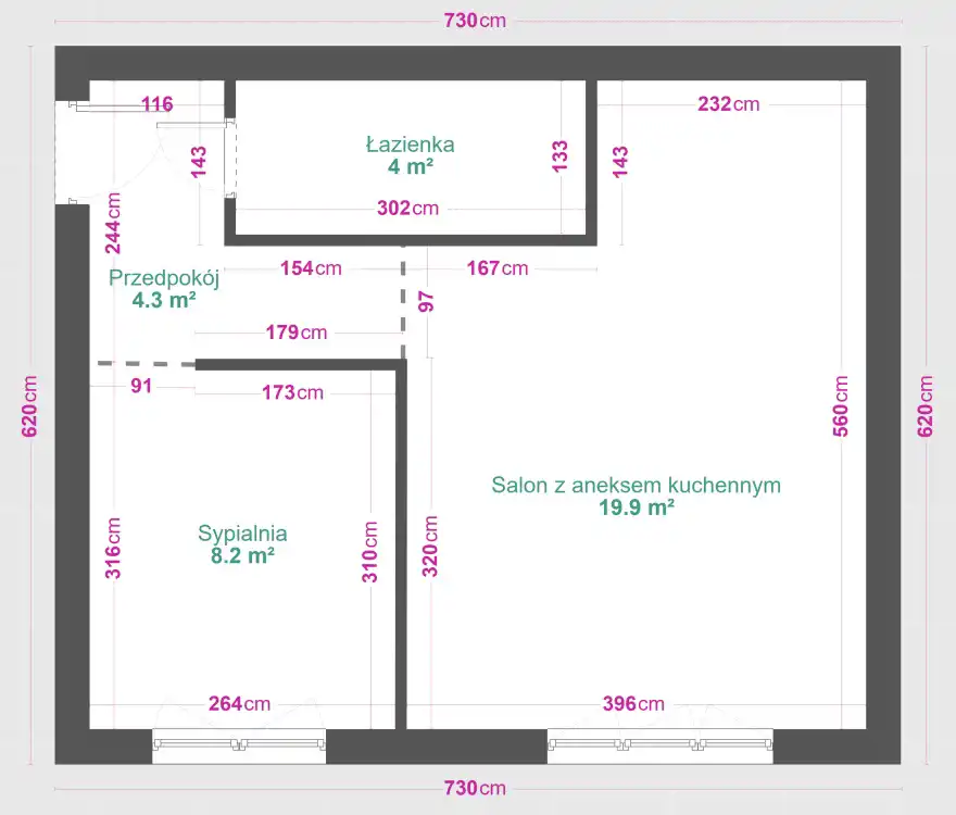 Mieszkanie zostało zaprojektowane funkcjonalnie, zapewniając maksymalne wykorzystanie przestrzeni. Salon z aneksem kuchennym tworzy jasną, otwartą część dzienną, a oddzielna sypialnia gwarantuje prywatność.