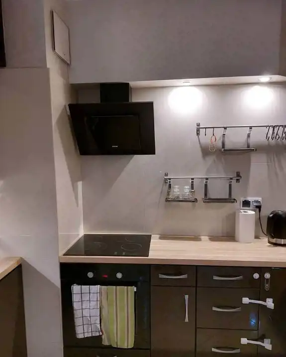 - Aneks w zabudowie z AGD (m.in. lodówka, zmywarka, płyta, piekarnik).