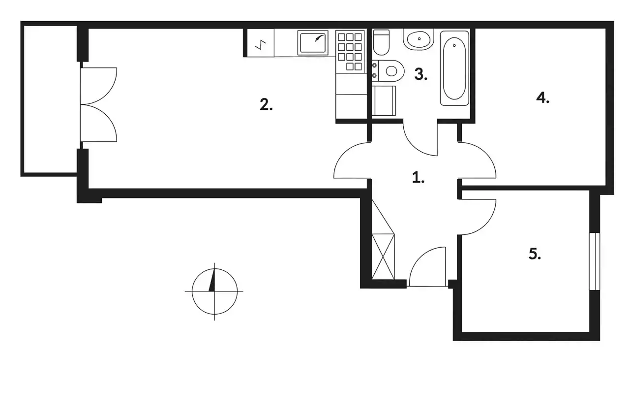 Rooms: living room with kitchenette, balcony, 2 bedrooms, bathroom with toilet, hallway.
