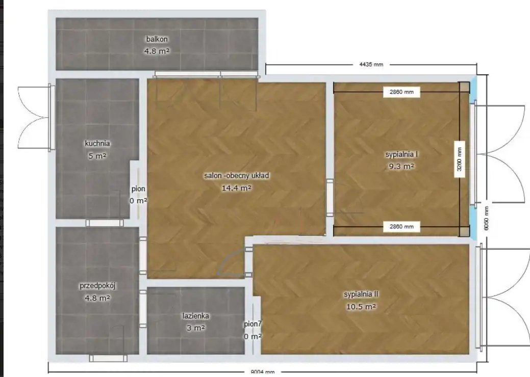 - dwie sypialnie ( do mniejszej wejście z pokoju dziennego)