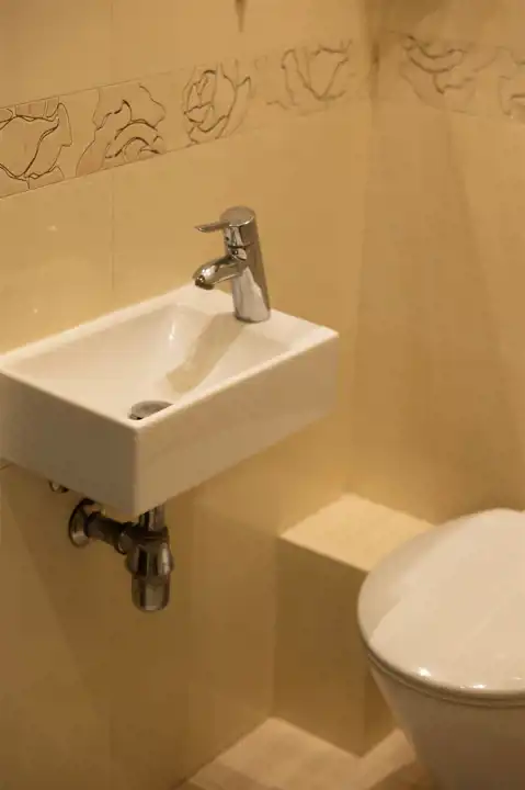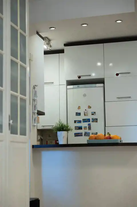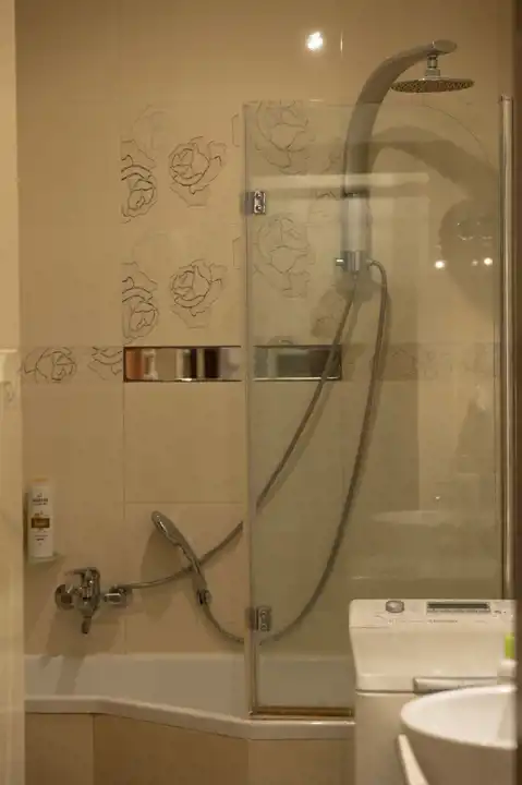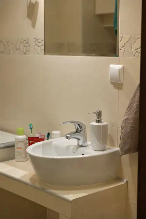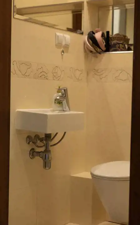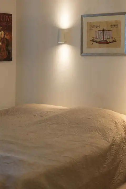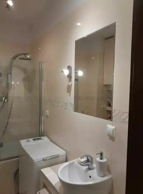 Oddzielna sypialnia gwarantuje spokój i miejsce do przechowywania. W mieszkaniu znajduje się łazienka i oddzielne WC w kolorystyce jasnego marmuru.