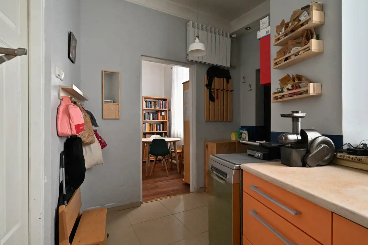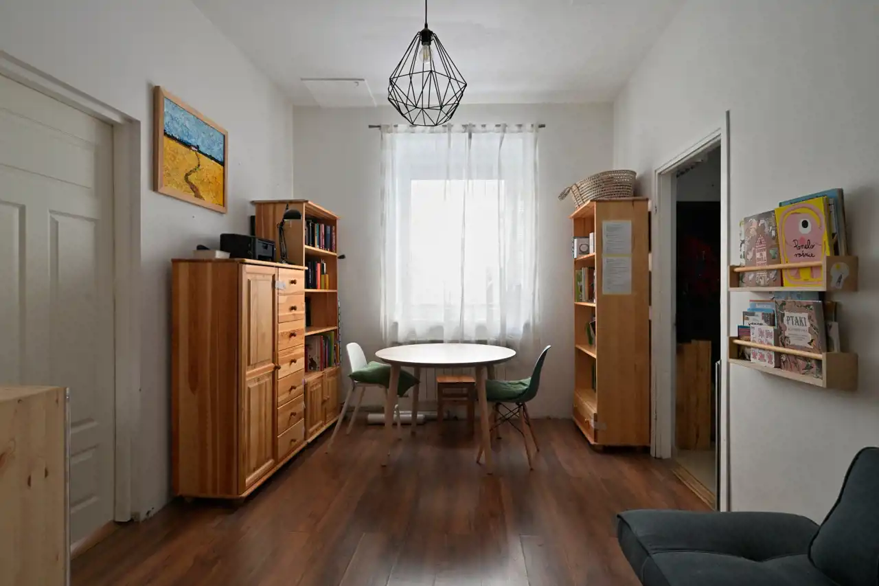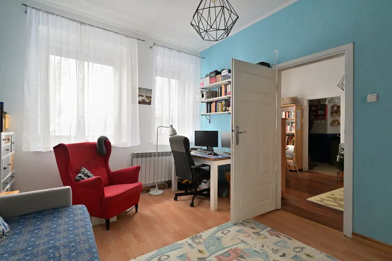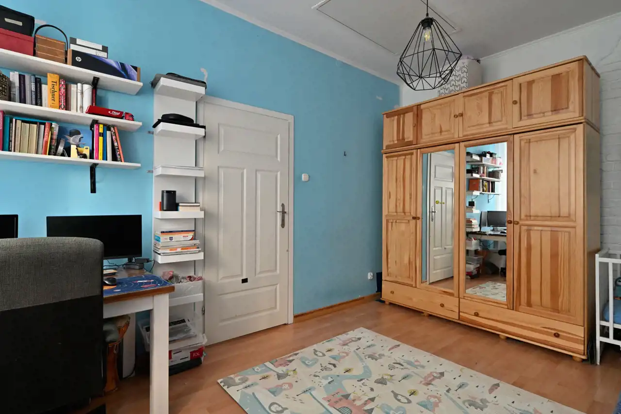 Mniejszy pokój pełni funkcję salonu i jadalni, z przejściem do ustawnej sypialni z dwoma oknami i miejscem na domowe biuro. Klimat kamienicy: grube mury, częściowo odsłonięta oryginalna cegła, duże okna i wysokość pomieszczeń ok. 3 m.