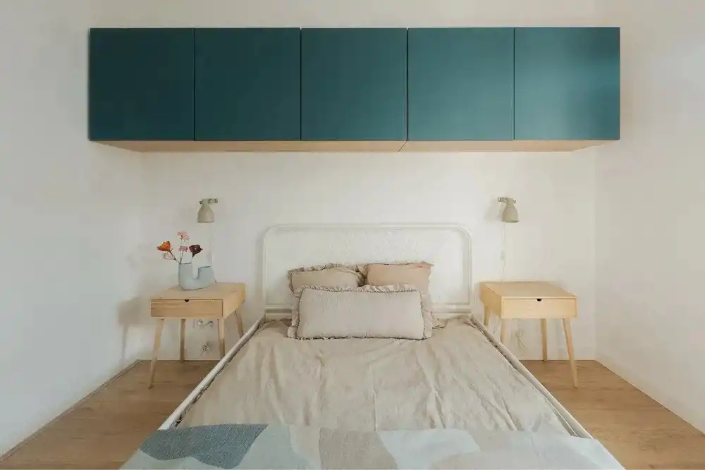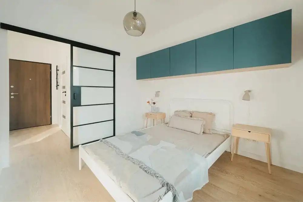 • przytulna sypialnia z łóżkiem i zabudową do przechowywania