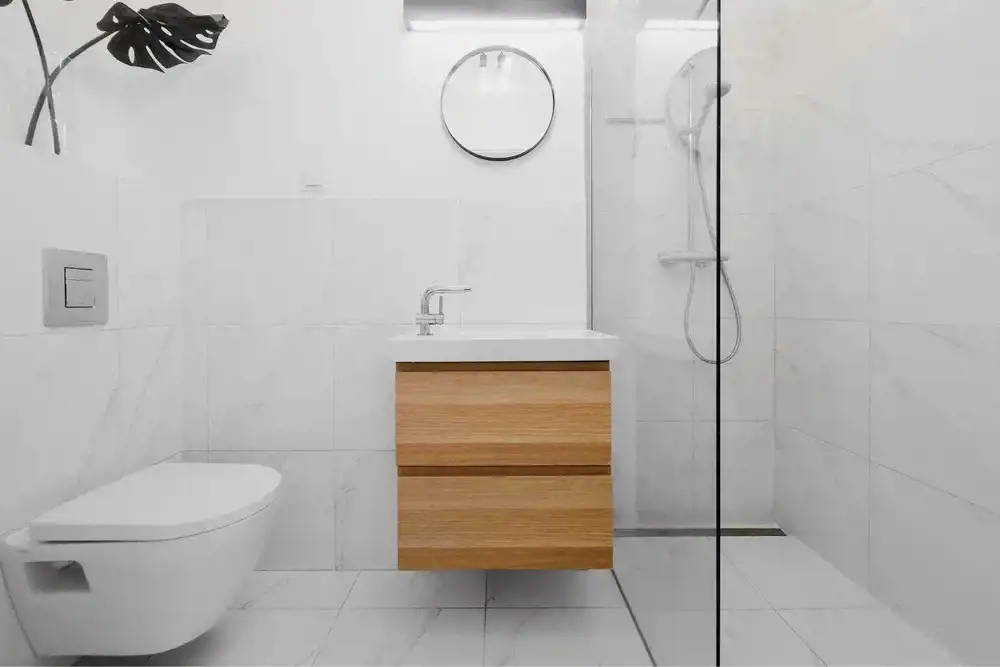 • elegancka łazienka z prysznicem walk-in, pralką i WC
