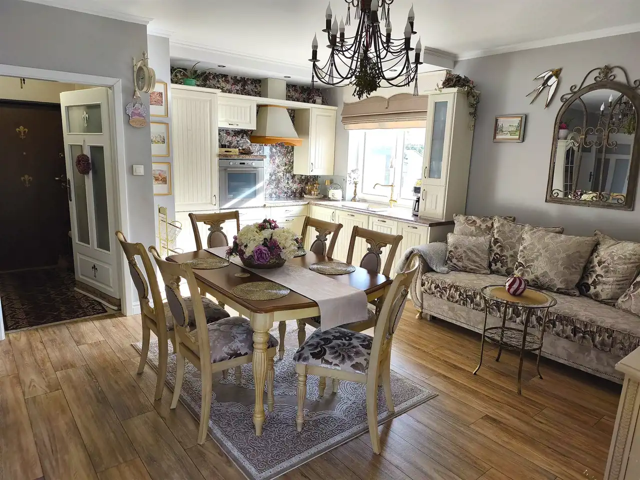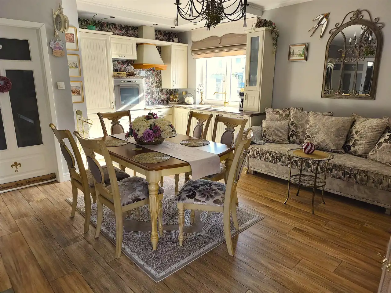 KUCHNIA została urządzona w stylu klasycznym z uwzględnieniem zasad ergonomii i wyposażoną ją w sprzęty znanych marek(płyta, piekarnik, lodówka, zmywarka). Zabudowa meblowa pomieści wszystkie niezbędne akcesoria a blat pozwoli wygodnie przygotowywać posiłki.