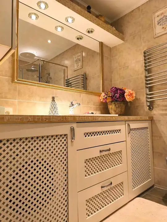Łazienka urządzona w ciepłych, stonowanych barwach płytek z kabiną prysznicową, pralką i dużym lustrem, komfortowym oświetleniem.