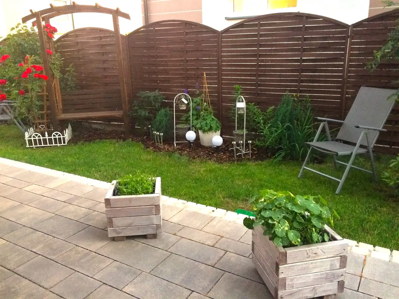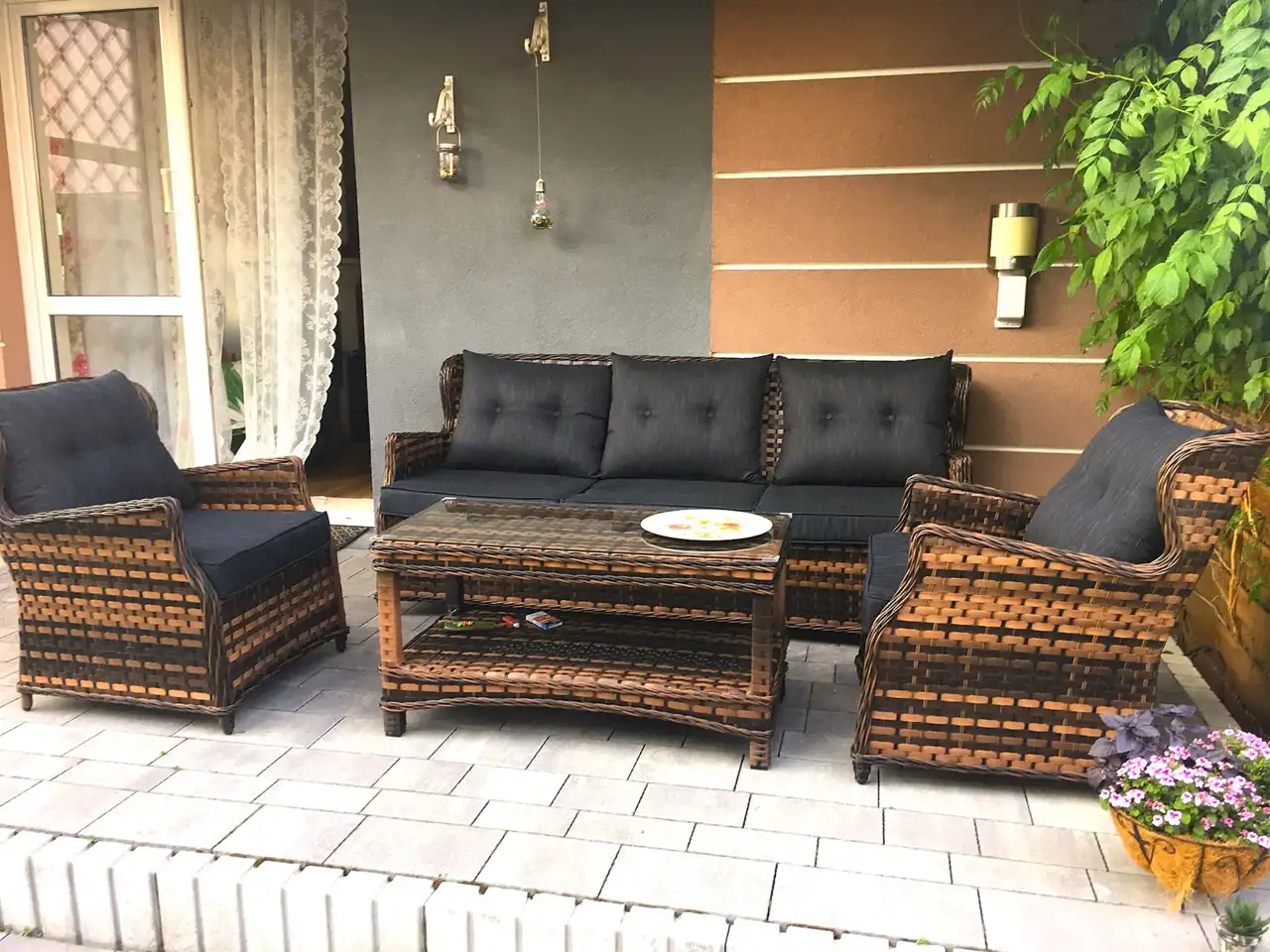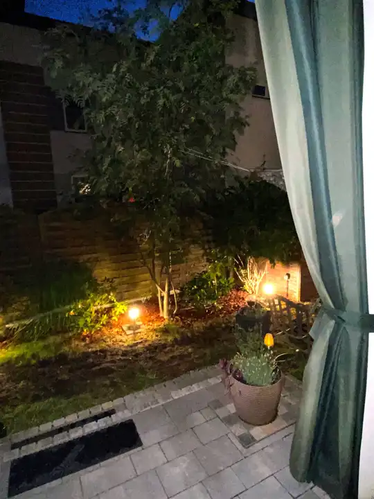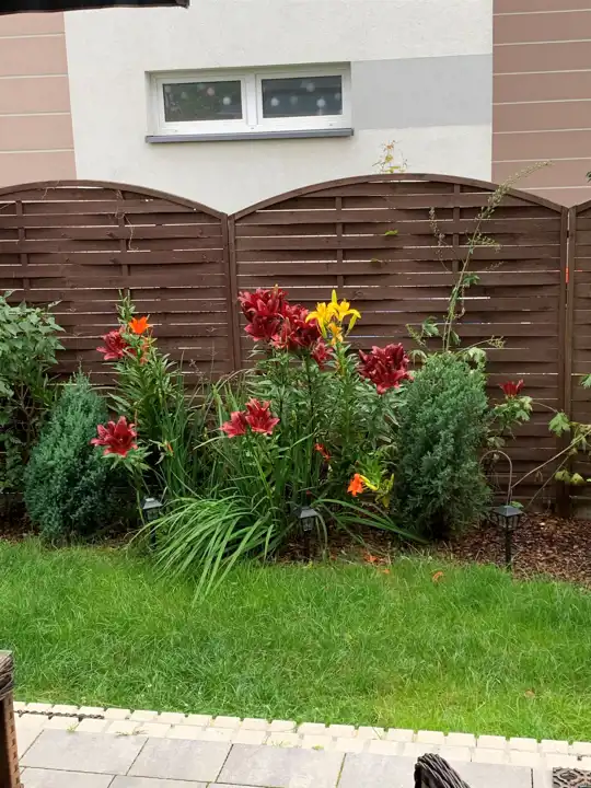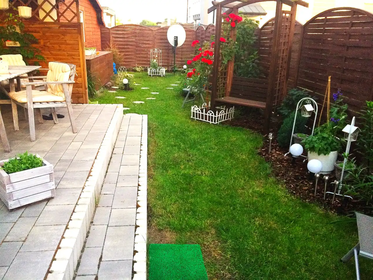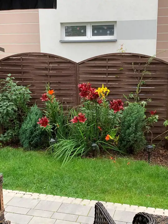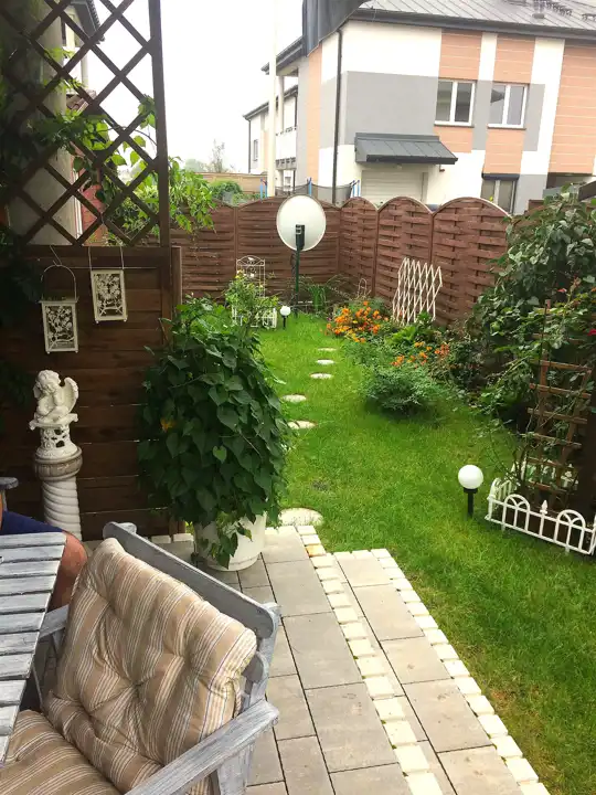 Łącznikiem mieszkania z ogrodem jest taras, na którym może wypoczywać cała rodzina. Dodatkowa markiza na tarasie chroni przed słońce w upalne dni. Ogród ma powierzchnię 104m2 a zadbane nasadzenia i system oświetlenia dodają mu wyjątkowego uroku. Na jego terenie znajdują się: mniejszy domek na akcesoria ogrodowo - działkowe ( np. kosiarka) oraz większy, w którym urządzono siłownię, mini - warsztat, magazynek i piwnicę. Opcja pozostawienia mebli ogrodowych za dodatkową opłatą.