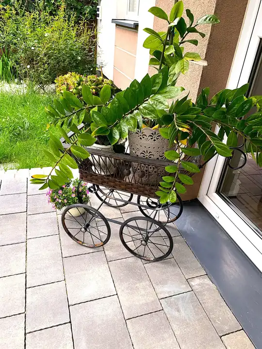 - mniejszy domek ogrodowo – narzędziowy z wyposażeniem ogrodowym (kosiarka, taczka, wąż do podlewania)