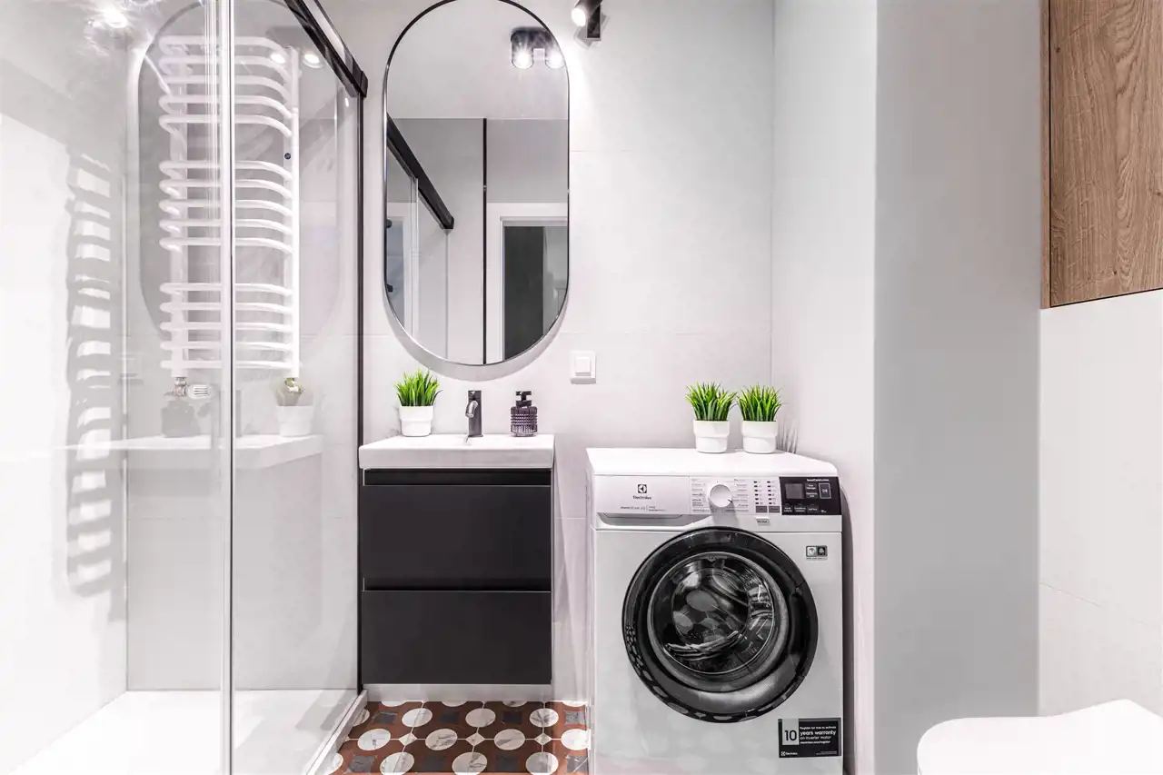 - Łazienka: duża kabina prysznicowa, umywalka, szafki, pralka, WC;