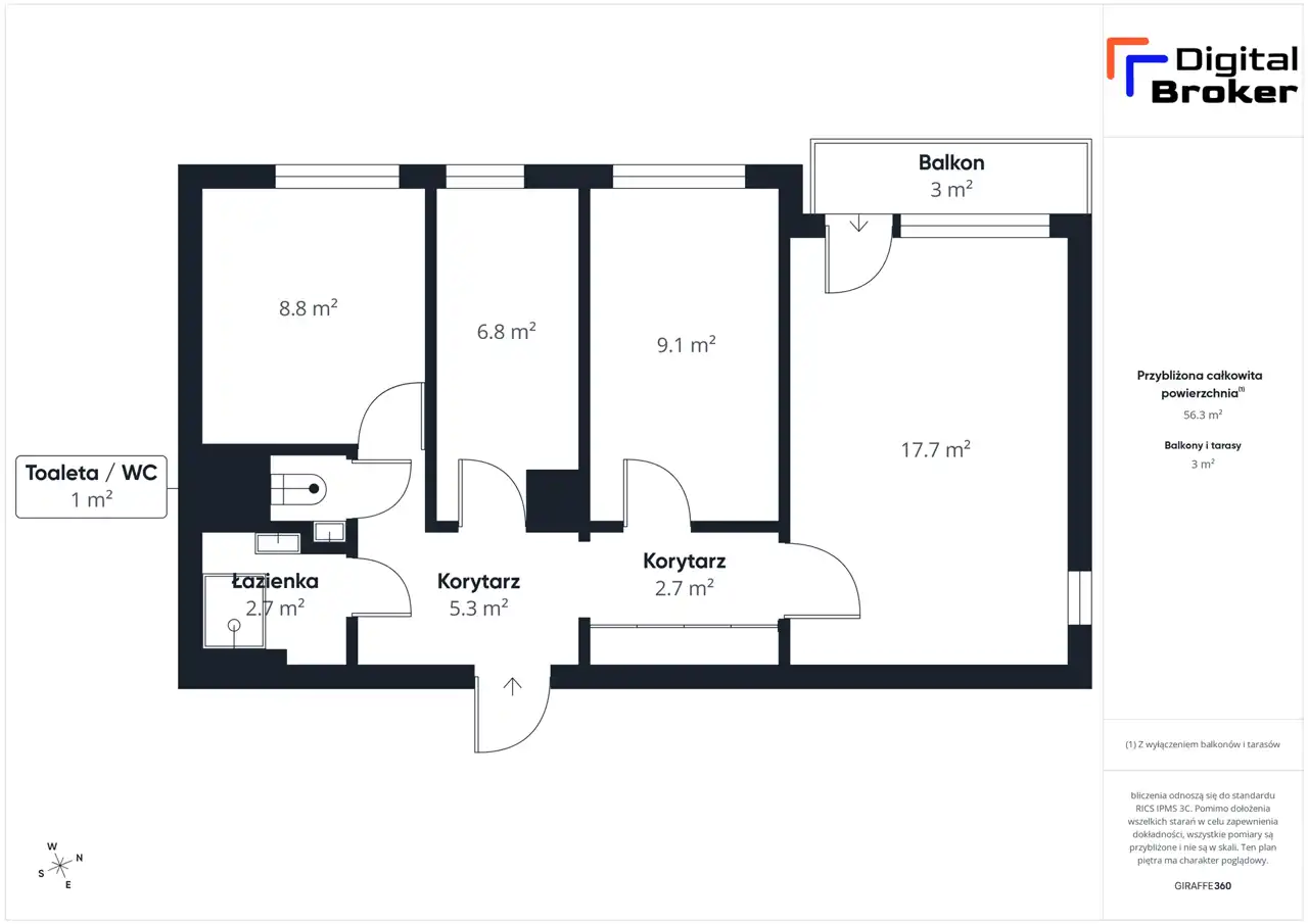 - Charakterystyka mieszkania 56.3 m2, 3 pokoje
