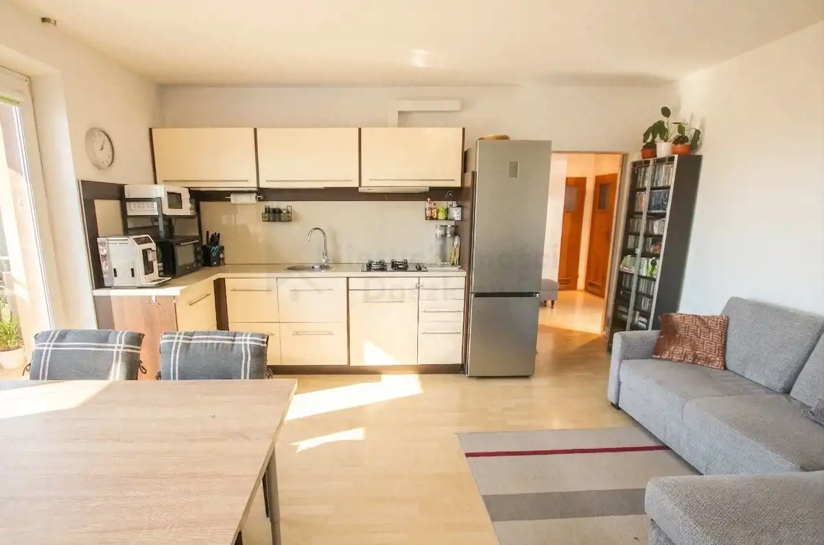 Pokój dzienny z aneksem kuchennym 21.62m2 - na podłodze panele.