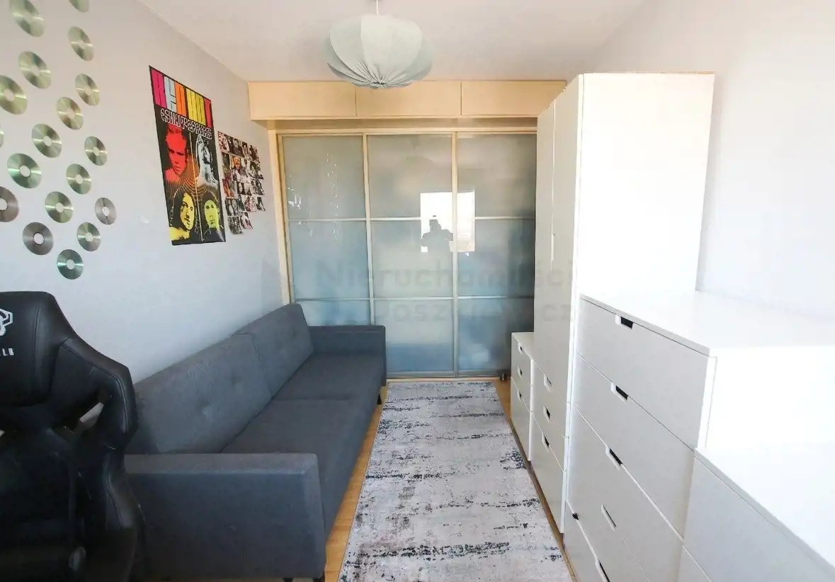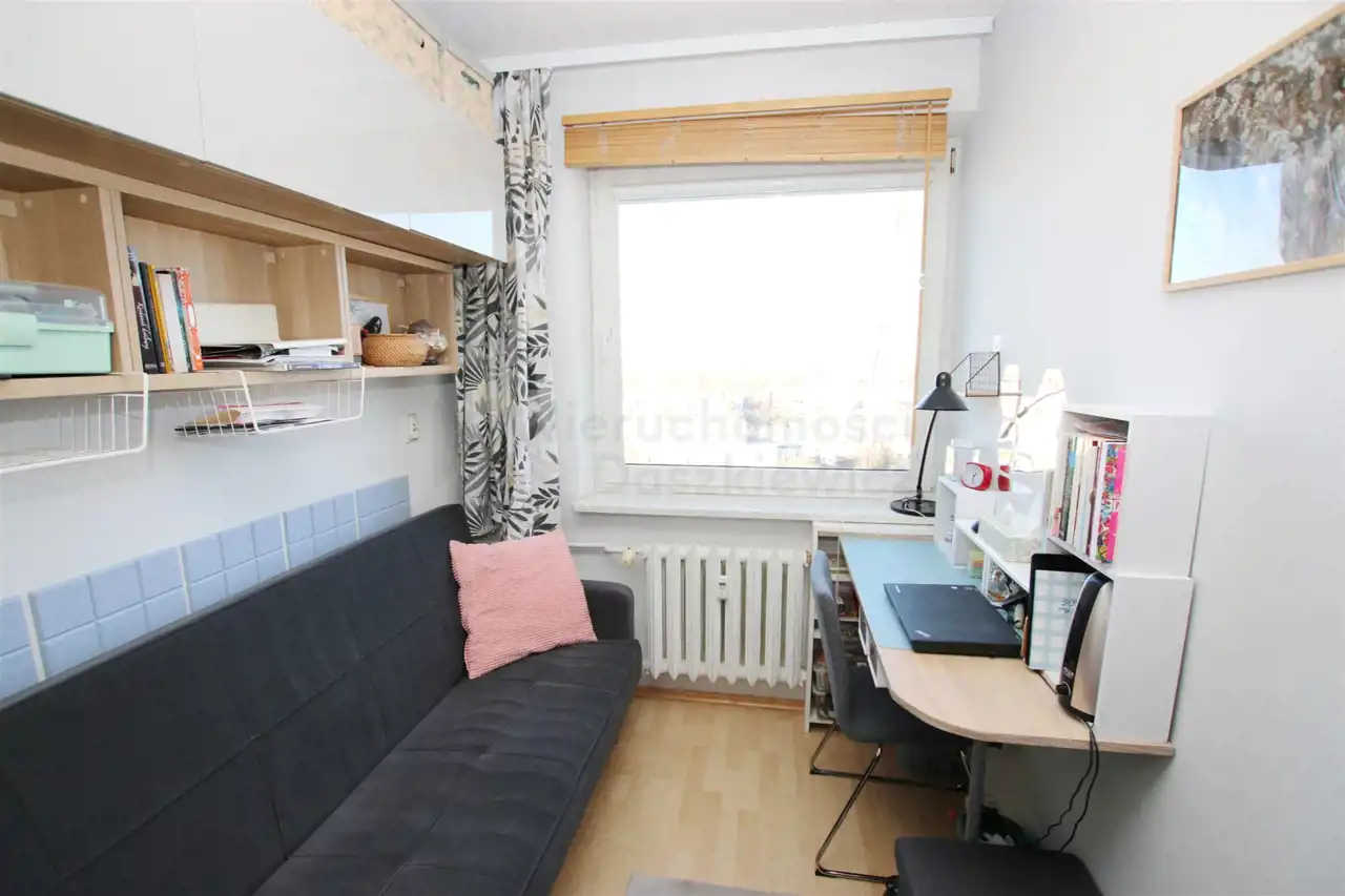 Pokój 11.95m2 - na podłodze panele, dodatkowo zabudowana jest pojemna szafa wnękowa.