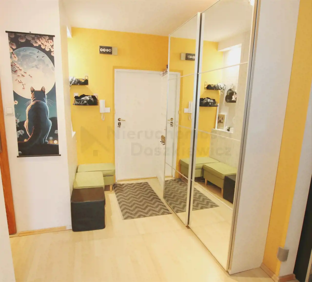 Hol 8.1m2 - na podłodze panele, dodatkowo znajdziemy tu pojemną szafę na ubrania.