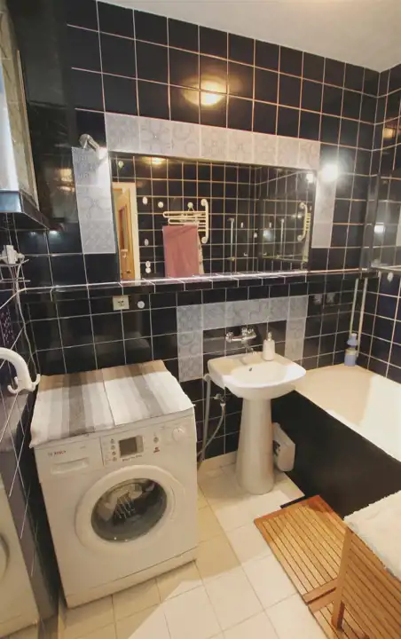 Łazienka 3m2 - terakota, glazura, umywalka, wanna, pralka.