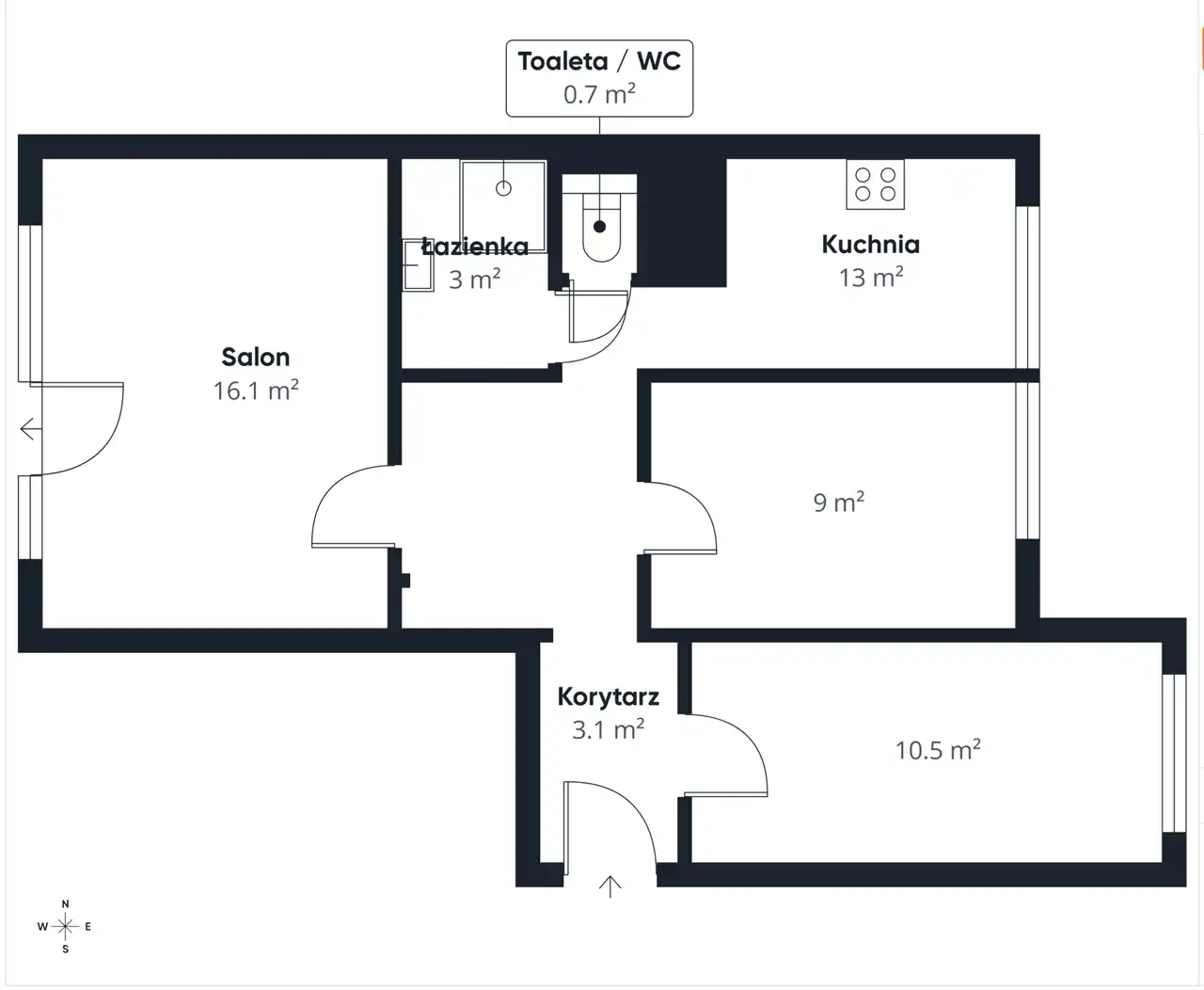 Istnieje możliwość przeniesienia kuchni do salonu lub drugiego przedpokoju, co pozwala na wydzielenie czwartego pokoju – doskonałe rozwiązanie inwestycyjne (np. pod wynajem).