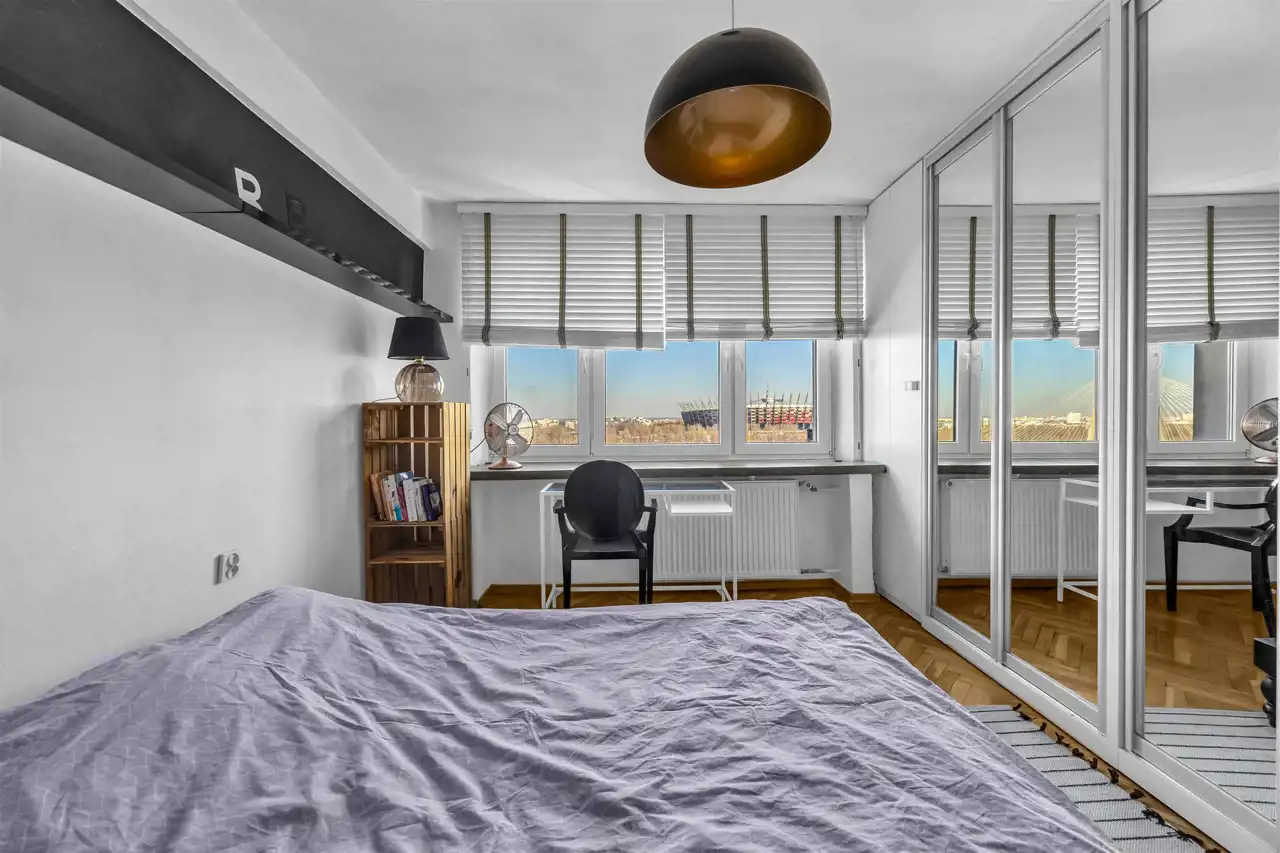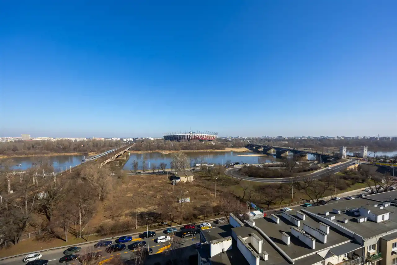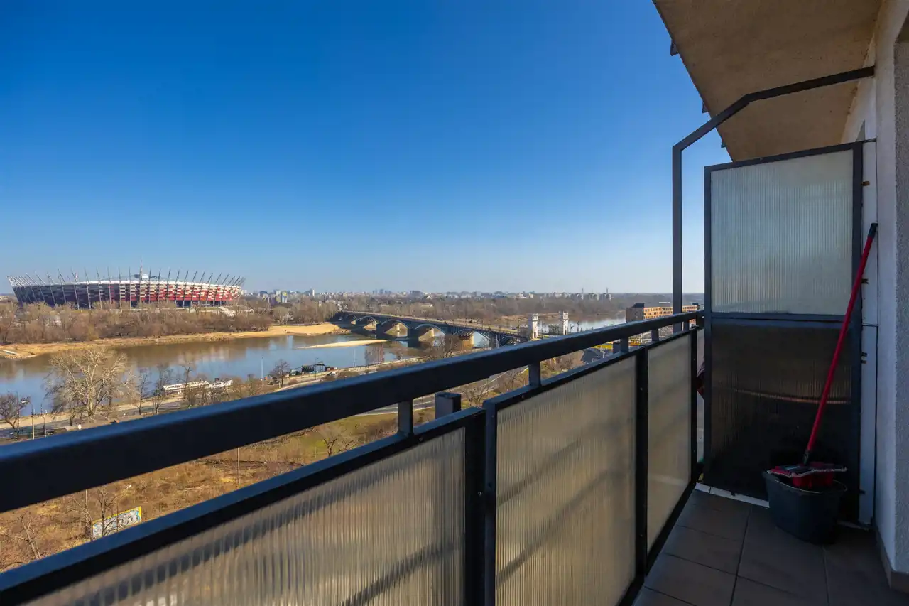 Z kolei okna w salonie i sypialni wychodzą na stronę wschodnią – z widokiem na Wisłę oraz Stadion Narodowy. Z mieszkania rozciąga się szeroka panorama prawej części Warszawy.