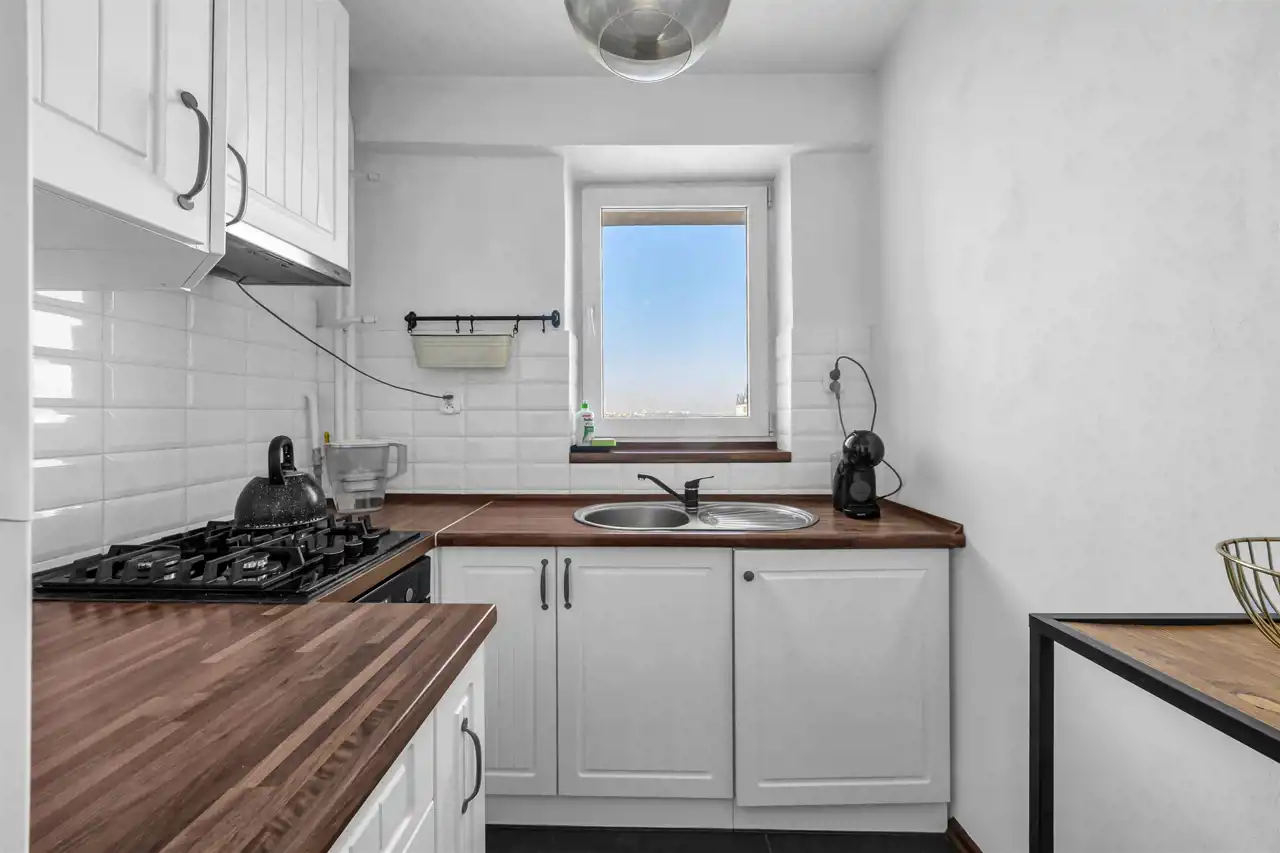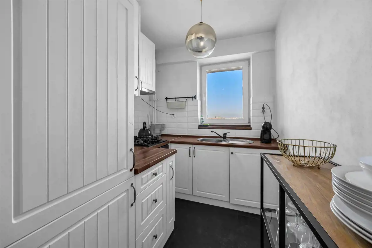 Kuchnia posiada okno z widokiem na dachy Śródmieścia, w kierunku Starego i Nowego Miasta.