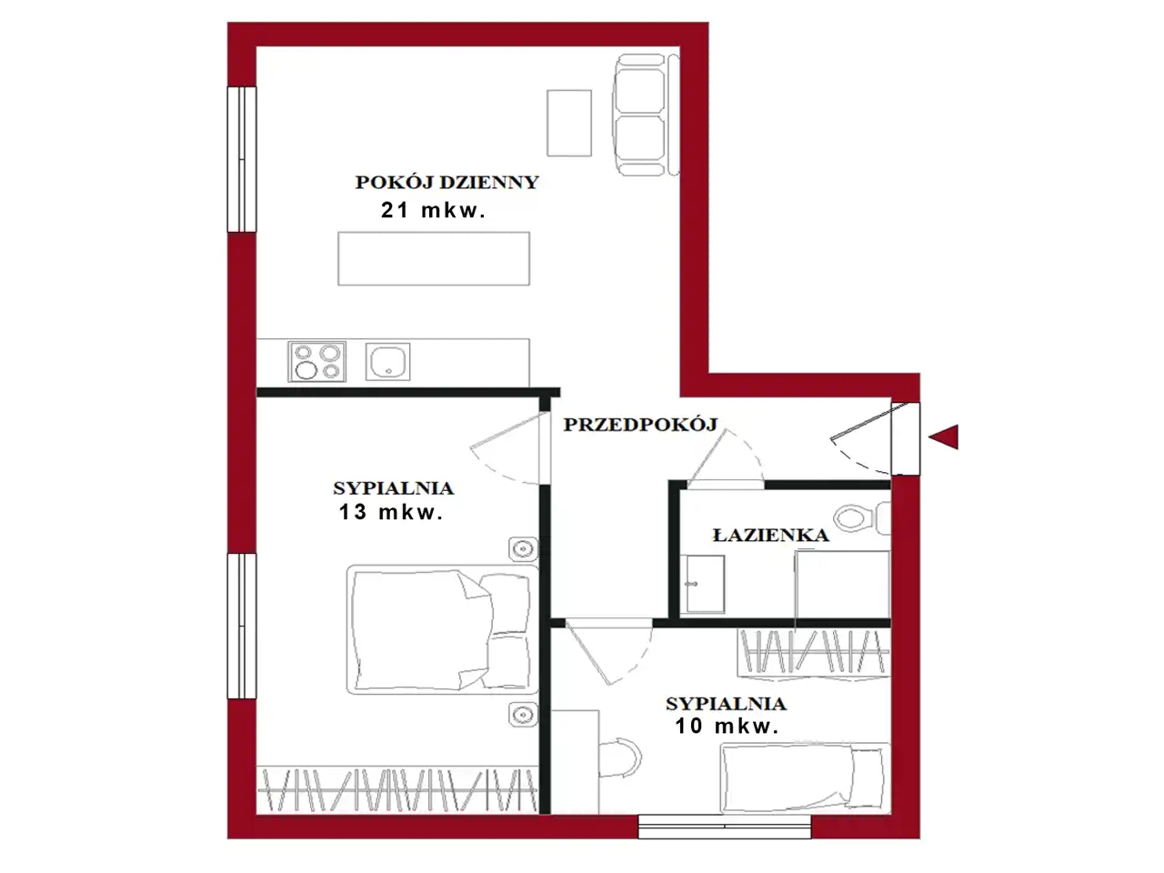 - pokój dzienny z widnym aneksem kuchennym (pow. 21 m.kw.);