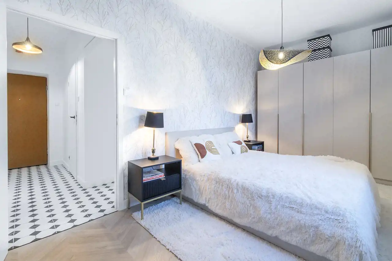 Główna sypialnia: Miejsce do odpoczynku, z subtelnie dobranymi kolorami i materiałami sprzyjającymi relaksowi, naturalne światło dodaje lekkości. 2 obszerne szafy do przechowywania ubrań.