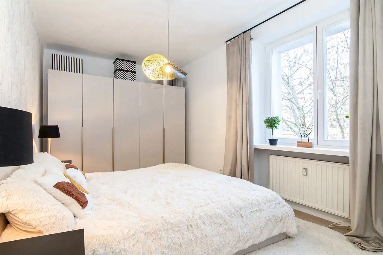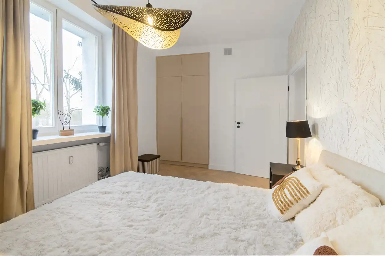 Główna sypialnia: Miejsce do odpoczynku, z subtelnie dobranymi kolorami i materiałami sprzyjającymi relaksowi, naturalne światło dodaje lekkości. 2 obszerne szafy do przechowywania ubrań.
