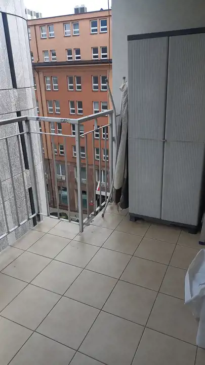 Funkcjonalny apartyament o pow.39,65 m2 zlokalizowany jest na 6 piętrze w 7- mio piętrowym budynku. Dużym atutem jest przesronny balkon, na którym mieści się dużą szafa i stolik z fotelami. Lokal jest dwustronny, wysoki, o dużych panoramicznych oknach, przez co wydaje się większy i bardziej przestronny.
