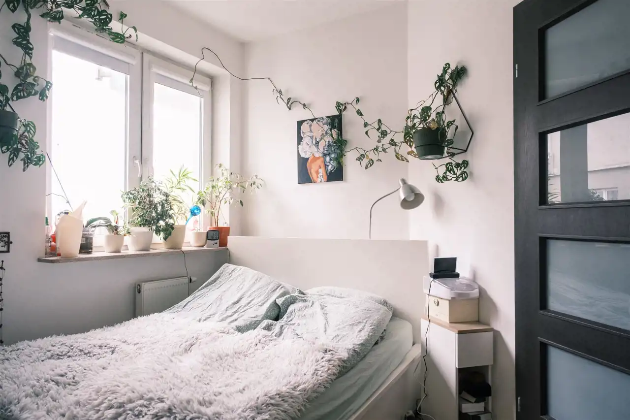 W sypialni rolety zacieniajace.