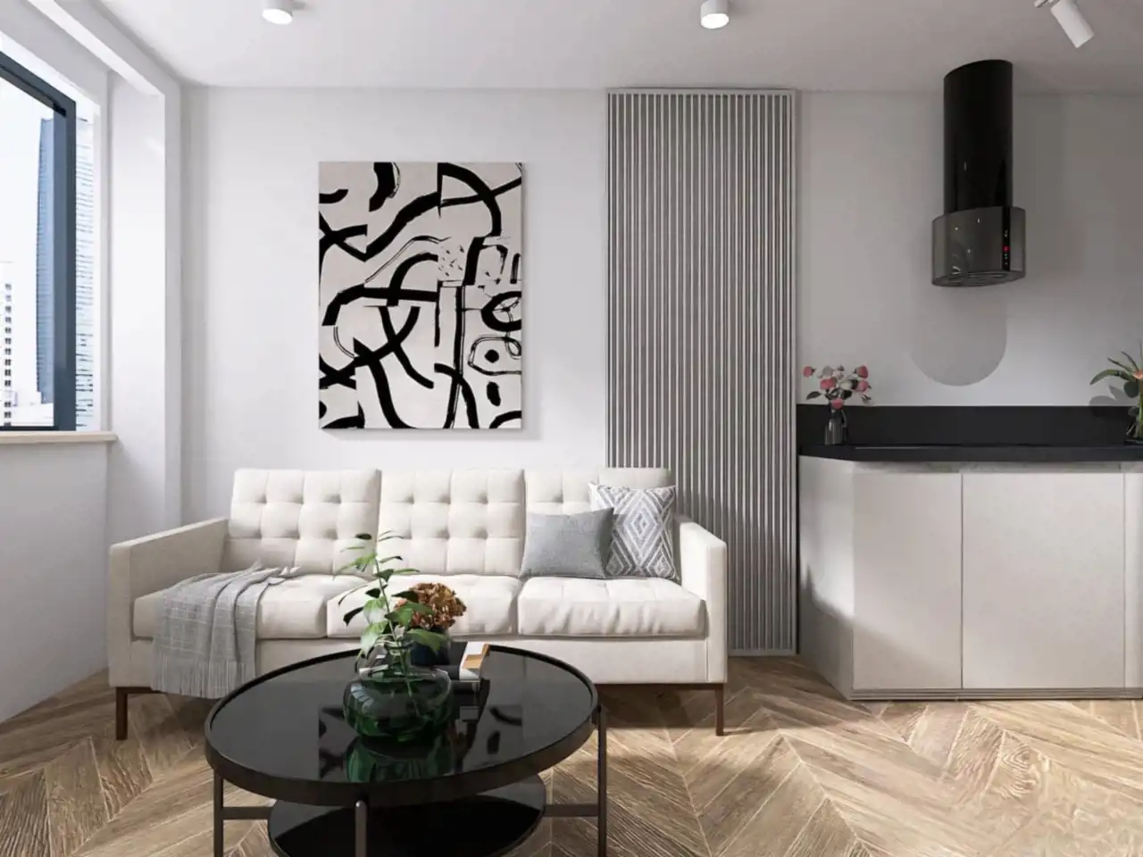 - salon z aneksem kuchennym z wyjściem na balkon (loggia) z widokiem na centrum Warszawy – szczególnie efektowny wieczorami i nocą