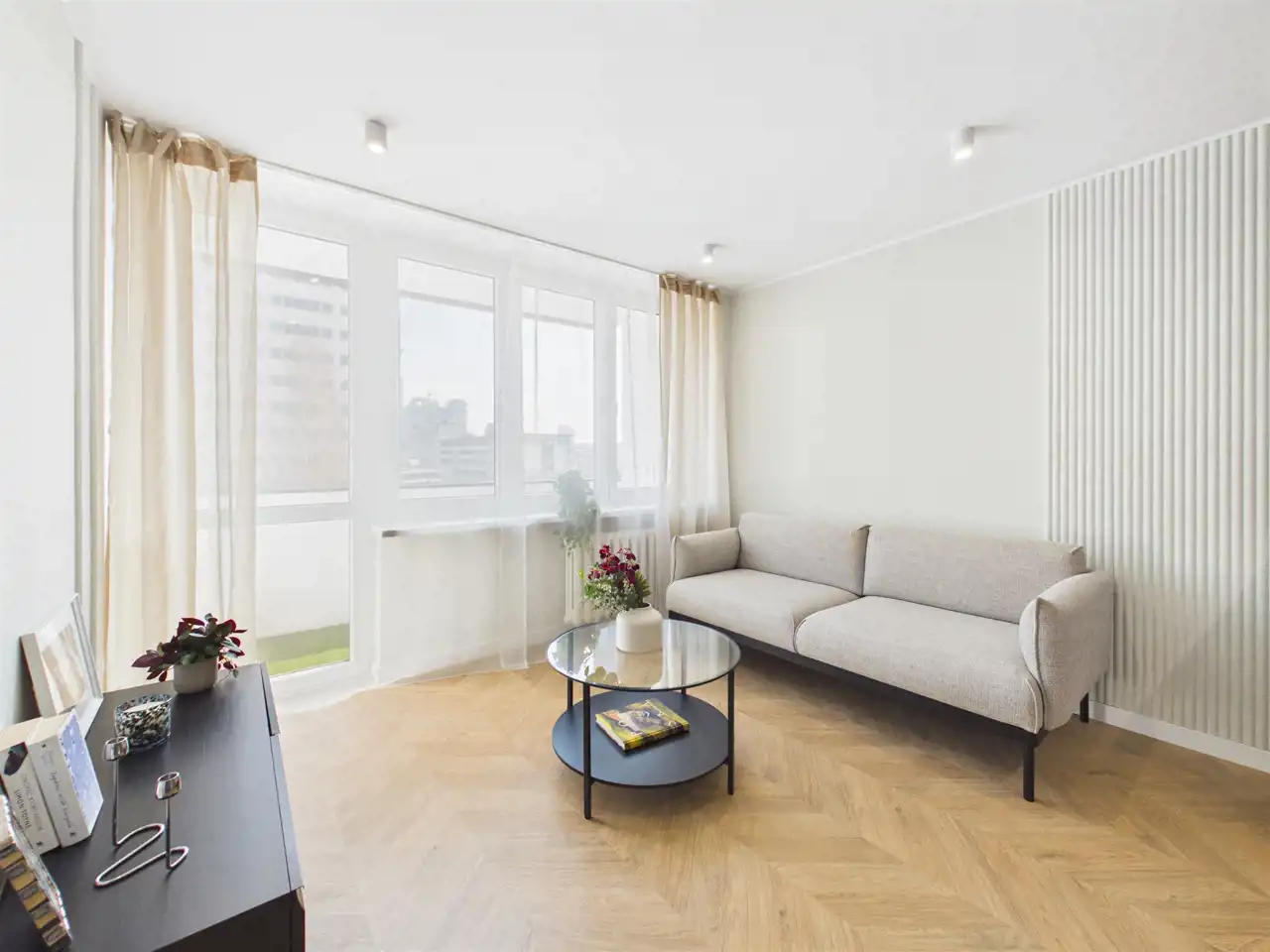 Mieszkanie jest jasne i dobrze doświetlone, dzięki dużym oknom i ekspozycji na wschód oraz zachód.