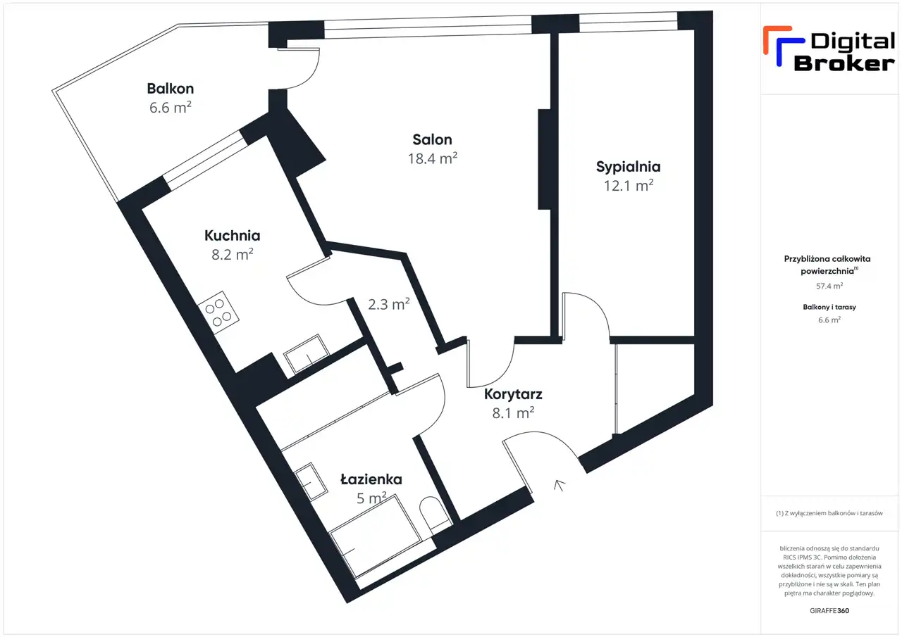 - Charakterystyka mieszkania 57.4 m2, 2 pokoje