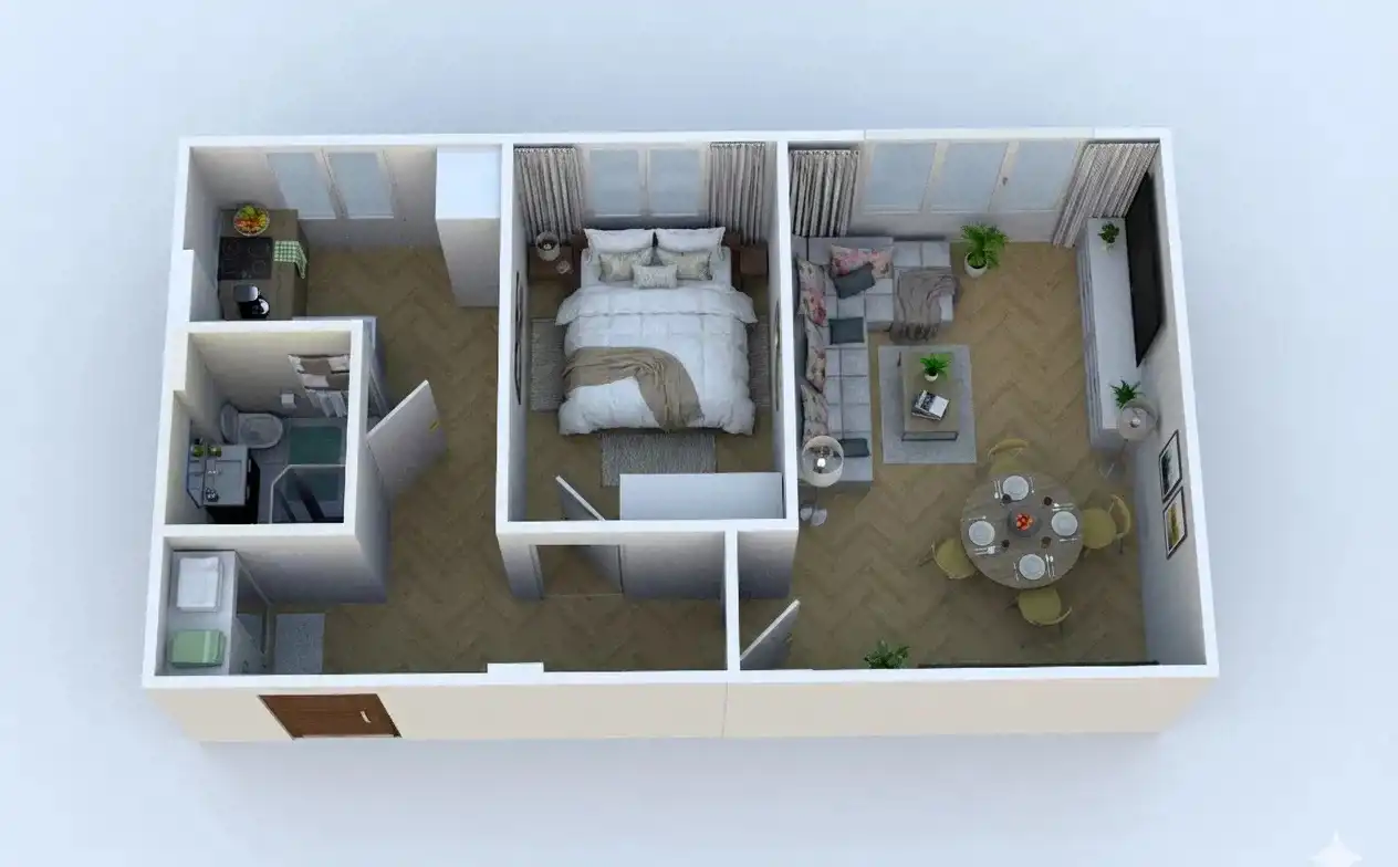 -- Jest możliwe przeniesienie kuchni do dużego pokoju (ok. 21m2) i wówczas mieszkanie będzie posiadało 2 oddzielne sypialnie i salon aneksem kuchennym.